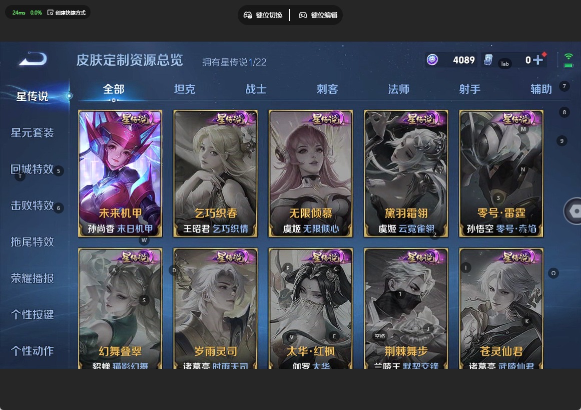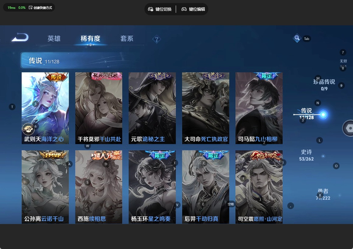 甄姬幽恒,伽罗太华,小乔纯白花嫁,典韦岱宗,项羽霸王别姬,后羿如梦令,后羿辉光之辰,庄周玄嵩,庄周云端筑梦师,裴擒虎李小龙,上官婉儿梁祝,花木兰青春决赛季,马可波罗逐梦之星,孙悟空至尊宝,赵云引擎之心,妲己时之彼端,韩信飞衡,虞姬霸王别姬,嫦娥如梦令,王昭君凤凰于飞