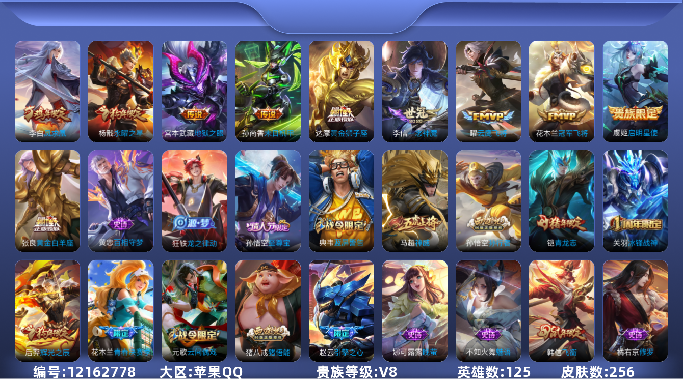 [12162778]V8 10传说 125英雄 256皮肤 典藏英雄武则天 可修改实名 优质装备:黄金狮子座,冠军飞将,云鹰飞将(小将军),黄金白羊座,一念神魔,末日机甲-孙尚香(绿蚂蚱),地狱之眼 珍宝阁皮:优雅恋人,女武神 限定皮:至尊宝,凤求凰(白切鸡),神威(电光马子),飞衡(韩信年限),遇见飞天,高山流水,青龙志(铠年限),冰锋战神,天狼运算者,游园惊梦,逐梦之星,李小龙,永曜之星,辉光之辰,霸王别姬-虞姬,孙行者,猪悟能,引擎之心,青春决赛季 史诗皮:星界战将,龙之律动,百相守梦-百里守约,百相守梦-黄忠,紫霞仙子,苍穹之光,黄金分割率,特工魅影,千年之狐,永昼,魅语,蒙恬荣光圣徽,无限星赏官,冰冠公主,偶像歌手,晚萤,龙骑士(小龙虾),末日机甲-吕布,猫狗日记-孙策,猫狗日记-大乔,乱世虎臣,节奏热浪,修罗,女仆咖啡,摇滚巨星,水果甜心,天才门将,星夜王子,心灵骇客,功夫厨神,德古拉伯爵,暗隐猎兽者,幽灵船长,鬼剑武藏,心灵战警,舞动绿茵,地狱岩魂,纤云弄巧,缤纷独角兽,乘风破浪,逐浪之夏,水晶猎龙者,热力回旋,箭羽风息,金属风暴,原初追逐者,圣诞狂欢,圣诞恋歌,鹰眼统帅,暗夜贵公子,黎明之约,奇遇舞章,未来纪元-赵云