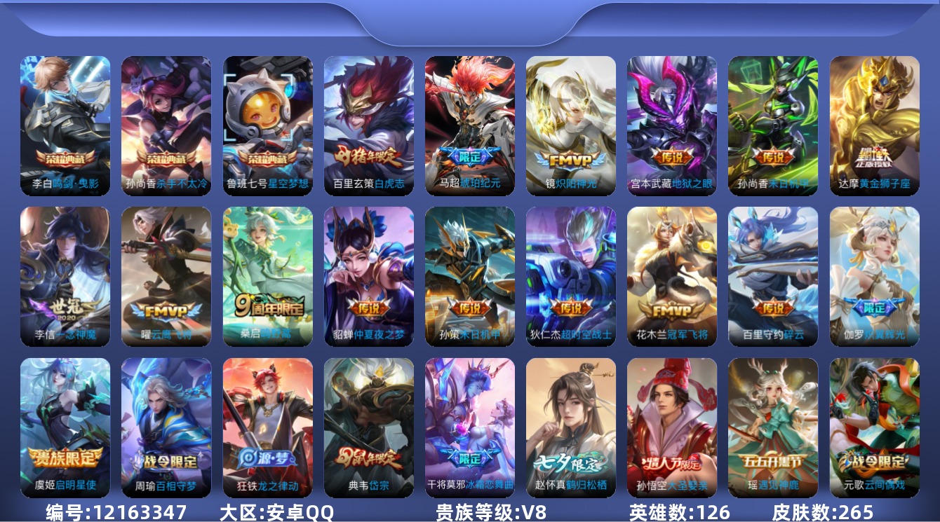 - [11626884]V10 15典藏 50传说 125英雄 454皮肤 典藏英雄武则天 可修改实名 优质装备:天鹅之梦(小乔典藏),星空梦想(太空人),倪克斯神谕(宇宙婆娘),无限飓风号(高达),活力突击,杀手不太冷,大秦宣太后,鸣剑·曳影,全息碎影(猴子典藏),星域神启(倪克斯贼亮),九霄神辉(木兰典藏),赤影疾锋,银白咏叹调(倪克斯侍卫),幻阙歌(貂蝉典藏),神鉴启示录,黄金射手座,猫影幻舞,炽阳神光,一念神魔,末日机甲-孙尚香(绿蚂蚱),地狱火,仲夏夜之梦(大飞蛾),音你心动-小乔,零号·赤焰,海洋之心,飞鸢探春,音你心动-周瑜,胖达荣荣,李逍遥,乞巧织情,时之恋人-刘备(电焊工),游龙清影(小青龙),淬星耀世,遇见胡旋,末日机甲-孙策,花朝如约(花篮子),挚爱之约,挚爱花嫁,无双飞将,音你闪耀(rap皮),碎云,天秀幻梦,神器·狴犴令,艾琳觅芳踪 珍宝阁皮:优雅恋人,女武神,玩趣恶龙 限定皮:逐霄战戟,鸣野蒿,凤求凰(白切鸡),凤凰于飞,太华(伽罗年限),武陵仙君(小桃花),异界灵契(白毛香),傲雪梅枪,补天,寅虎·展翼(孙膑年限),前尘镜,星穹之声,绯月行,时之彼端,白鹤梁神女,白晶晶,时雨天司(水龙头),神威(电光马子),山海·碧波行(瑶年限),瑞麟志(木兰年限),高山流水,匿光决锋者,五谷丰年,青龙志(铠年限),冰锋战神,武圣,天狼运算者,梁祝,御风骁将(吕布年限),天狼狩猎者,逐梦之星,岱宗(典韦年限),天狼溯光者,奔雷神使(牛魔年限),祈雪灵祝(雪兔子),天狼绘梦者,李小龙,逐梦之影,逐梦之光,玄武志(苏烈年限),朱雀志(守约年限),如梦令-嫦娥,如梦令-后羿,霸王别姬-项羽,霸王别姬-虞姬,奇迹圣诞,默契交锋-兰陵王,默契交锋-花木兰,真爱至上,纯白花嫁,孙行者,猪悟能,一生所爱,天魔缭乱,青春决赛季,冰霜恋舞曲,云端筑梦师,乒乒小将,蜜橘之夏,热情桑巴,神奇女侠,匿光追影者,女儿国国王,寅虎·御盾(廉颇年限),寅虎·瑞焰(虎皮蛋子),寅虎·心曲(虎婆),寅虎·赤拳(老虎年限),时之祈愿-云中君,时之祈愿-瑶(瑶传限),百木心枪,玉兔公主,启示之音,无尽星芒,深海之息(深海大菠萝),唐三藏,枫霜尽,匿光启智者,时之奇旅-妲己,神器·万象笔,梦圆繁星 史诗皮:化蝶舞,灵蛊蚀心,龙之律动,石田雨龙,百相守梦-周瑜,百相守梦-黄忠,遇见神鹿,紫霞仙子,苍穹之光,电玩小