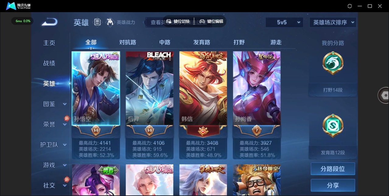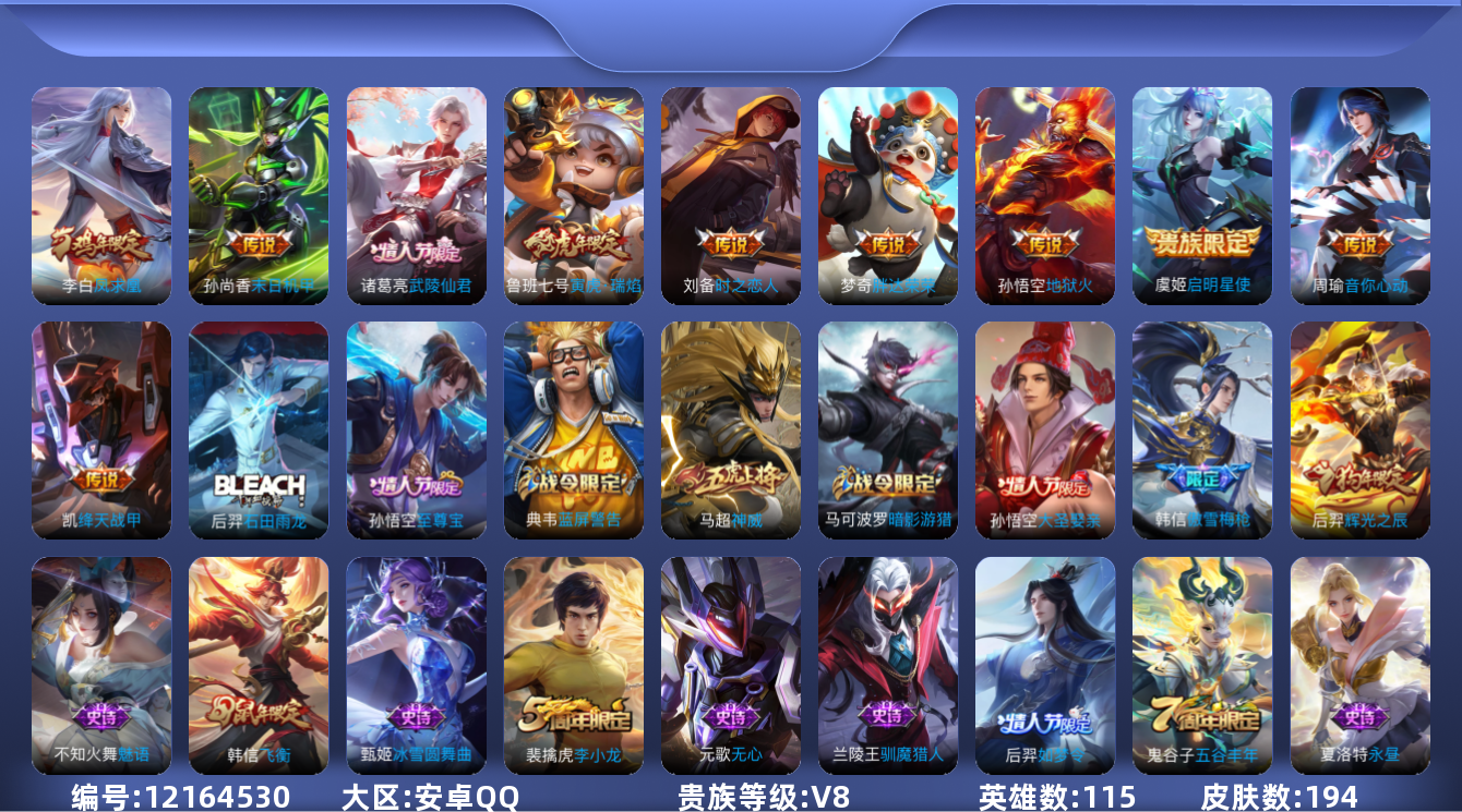 - PX_2095048-实名: 可修改 贵族等级: V5 英雄数: 63 皮肤数: 43 传说皮: 典韦战鼓燎原