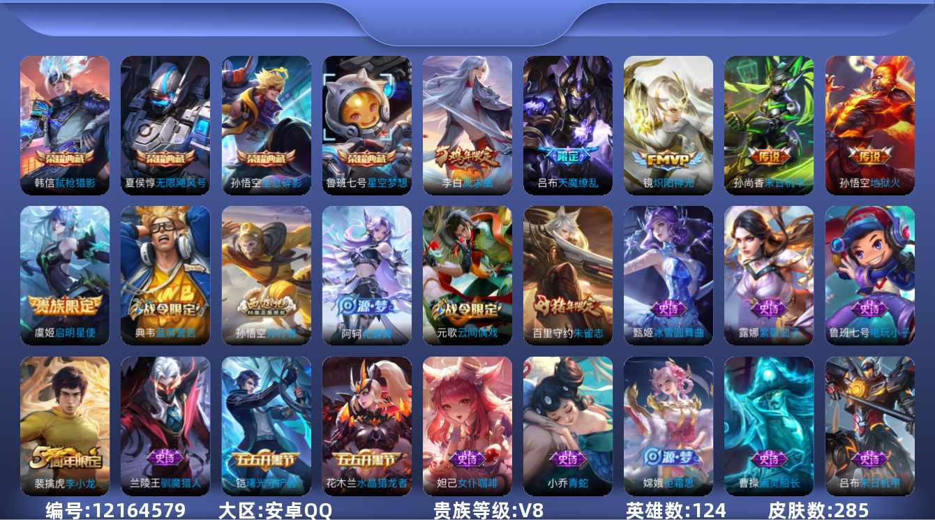 [12164579]【商品标题】:安卓Q-V7-永恒钻石III段位-124英雄-285皮肤-4典藏-0珍品无双-0无双-0珍品传说-6传说-72史诗