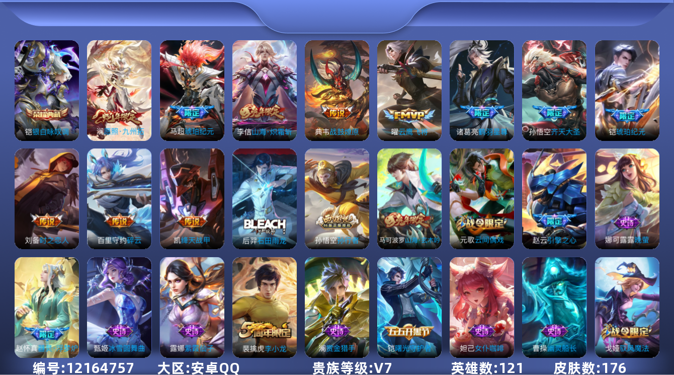 [12164757]V7 1典藏 11传说 121英雄 176皮肤 可修改实名 优质装备:银白咏叹调(倪克斯侍卫),云鹰飞将(小将军),绛天战甲(鸡嘴战神),时之恋人-刘备(电焊工),碎云,山海·炽霜斩(李信年限),鹤羽星尊,琥珀纪元铠,琥珀纪元马超 传说皮:典韦战鼓燎原 珍宝阁皮:蔷薇恋人 限定皮:愿照·九州拓(澜年限),齐天大圣,李小龙,孙行者,引擎之心,美猴王,山海·玄木吟(马可年限) 史诗皮:器灵·浮梦炉,石田雨龙,紫霞仙子,黄金分割率,特工魅影,冰冠公主,匿光侦查者,高渐离燃音魔法,晚萤,末日机甲-吕布,猫狗日记-孙策,猫狗日记-大乔,乱世虎臣,节奏热浪,女仆咖啡,摇滚巨星,水果甜心,星夜王子,德古拉伯爵,暗隐猎兽者,幽灵船长,鬼剑武藏,心灵战警,地狱岩魂,纤云弄巧,乘风破浪,曙光守护者,热力回旋,箭羽风息,金属风暴,鹰眼统帅,赏金猎手