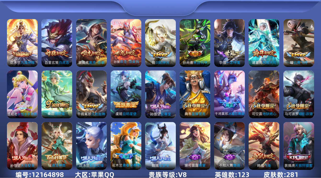 [12164898]V8 1典藏 12传说 123英雄 281皮肤 可修改实名 优质装备:九霄神辉(木兰典藏),云鹰飞将(小将军),久胜战神,炽阳神光,一念神魔,末日机甲-孙尚香(绿蚂蚱),永恒水手月亮 传说皮:乘龙·淬吴钩(孙策年限) 珍宝阁皮:万物之道,蔷薇恋人,玩趣恶龙 限定皮:鸣野蒿,至尊宝,白虎志(电光耗子),时雨天司(水龙头),飞衡(韩信年限),遇见飞天,五谷丰年,梁祝,天狼狩猎者,龙胆,李小龙,逐梦之影,如梦令-嫦娥,如梦令-后羿,霸王别姬-项羽,霸王别姬-虞姬,默契交锋-花木兰,大圣娶亲,青春决赛季,冰霜恋舞曲,寅虎·御盾(廉颇年限),寅虎·赤拳(老虎年限) 史诗皮:星界战将,超元猎域,遇见神鹿,紫霞仙子,苍穹之光,白龙吟,黄金分割率,特工魅影,千年之狐,永昼,江河有灵,魅语,百解令(蒙犽),蒙恬荣光圣徽,无限星赏官,匿光破解者,冰冠公主,偶像歌手,晚萤,电玩·爆裂旋风,末日机甲-吕布,猫狗日记-孙策,猫狗日记-大乔,时之恋人-孙尚香,乱世虎臣,节奏热浪,修罗,女仆咖啡,摇滚巨星,水果甜心,天才门将,星夜王子,心灵骇客,功夫厨神,德古拉伯爵,暗隐猎兽者,幽灵船长,鬼剑武藏,暗渊魔法,心灵战警,天秀·启明,舞动绿茵,地狱岩魂,纤云弄巧,繁星吟游(呼啦呼啦),拒霜思,缤纷独角兽,乘风破浪,逐浪之夏,水晶猎龙者,曙光守护者,箭羽风息,金属风暴,原初追逐者,圣诞狂欢,圣诞恋歌,鹰眼统帅,暗夜贵公子,魅力维加斯,黎明之约,赏金猎手,寅虎·御盾,无心,未来纪元-赵云