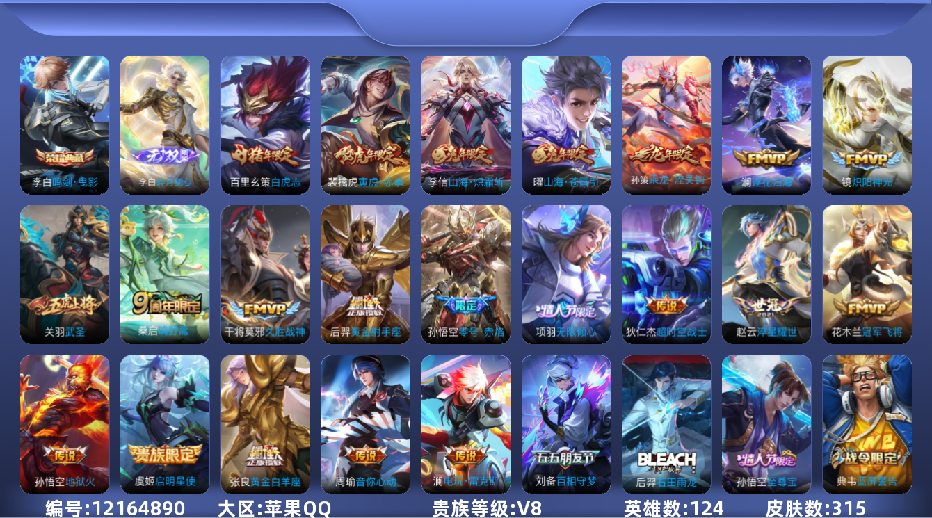 [12164890]V7 1典藏 1无双 21传说 124英雄 315皮肤 可修改实名 优质装备:鸣剑·曳影,碎月剑心(李白无双),黄金射手座,冠军飞将,黄金白羊座,久胜战神,炽阳神光,地狱火,零号·赤焰,音你心动-周瑜,淬星耀世,超时空战士-狄仁杰,山海·炽霜斩(李信年限),山海·苍雷引(电光曜子),电玩·雷克斯,澜逐花归海 传说皮:乘龙·淬吴钩(孙策年限) 珍宝阁皮:万物之道,优雅恋人,蔷薇恋人,女武神 限定皮:鸣野蒿,至尊宝,白虎志(电光耗子),傲雪梅枪,神威(电光马子),无限倾心-项羽,遇见飞天,高山流水,五谷丰年,冰锋战神,武圣,游园惊梦,梁祝,逐梦之音,李小龙,逐梦之影,朱雀志(守约年限),辉光之辰,霸王别姬-虞姬,孙行者,猪悟能,一生所爱,大圣娶亲,云端筑梦师,美猴王,匿光追影者,寅虎·赤拳(老虎年限),百木心枪,山海·玄木吟(马可年限) 史诗皮:石田雨龙,紫霞仙子,苍穹之光,电玩小子(小书包),白龙吟,黄金分割率,特工魅影,千年之狐,永昼,江河有灵,雪夜绮愿(周瑜),魅语,百解令(蒙犽),蒙恬荣光圣徽,冰冠公主,青蛇,偶像歌手,晚萤,电玩·爆裂旋风,百相守梦(刘备),暗夜猫娘,龙骑士(小龙虾),末日机甲-吕布,猫狗日记-孙策,乱世虎臣,节奏热浪,修罗,水果甜心,天才门将,星夜王子,心灵骇客,功夫厨神,德古拉伯爵,暗隐猎兽者,幽灵船长,鬼剑武藏,心灵战警,乐园奇幻夜,天秀·启明,舞动绿茵,地狱岩魂,纤云弄巧,繁星吟游(呼啦呼啦),缤纷独角兽,乘风破浪,逐浪之夏,水晶猎龙者,曙光守护者,箭羽风息,金属风暴,原初追逐者,圣诞狂欢,圣诞恋歌,鹰眼统帅,魅力维加斯,黎明之约,赏金猎手,无心,未来纪元-赵云