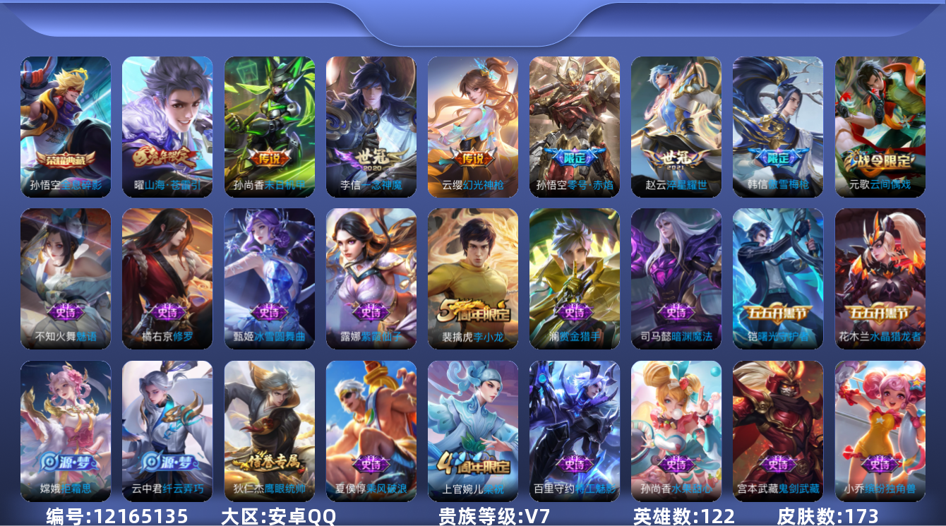 - [12279859]V9 2典藏 14传说 126英雄 322皮肤 典藏英雄武则天 可修改实名 优质装备:倪克斯神谕(宇宙婆娘),杀手不太冷,黄金狮子座,黄金射手座,冠军飞将,绛天战甲(鸡嘴战神),仲夏夜之梦(大飞蛾),地狱之眼,胖达荣荣,李逍遥,淬星耀世 珍宝阁皮:女武神 限定皮:鸣野蒿,凤求凰(白切鸡),凤凰于飞,白鹤梁神女,遇见飞天,高山流水,诗剑行,五谷丰年,冰锋战神,游园惊梦,梁祝,李小龙,大圣娶亲,天魔缭乱,美猴王 史诗皮:石田雨龙,百相守梦-黄忠,紫霞仙子,苍穹之光,电玩小子(小书包),白龙吟,黄金分割率,特工魅影,千年之狐,永昼,江河有灵,魅语,百解令(蒙犽),高渐离燃音魔法,蒙恬荣光圣徽,无限星赏官,冰冠公主,青蛇,偶像歌手,白蛇,晚萤,暗夜猫娘,龙骑士(小龙虾),末日机甲-吕布,猫狗日记-孙策,猫狗日记-大乔,时之恋人-孙尚香,乱世虎臣,节奏热浪,修罗,女仆咖啡,摇滚巨星,水果甜心,绅士熊喵,天才门将,星夜王子,心灵骇客,功夫厨神,德古拉伯爵,暗隐猎兽者,幽灵船长,鬼剑武藏,心灵战警,舞动绿茵,地狱岩魂,诗语江南,纤云弄巧,繁星吟游(呼啦呼啦),拒霜思,缤纷独角兽,乘风破浪,逐浪之夏,月团寄思,水晶猎龙者,曙光守护者,箭羽风息,金属风暴,原初追逐者,圣诞狂欢,圣诞恋歌,鹰眼统帅,暗夜贵公子,魅力维加斯,黎明之约,无心,未来纪元-赵云