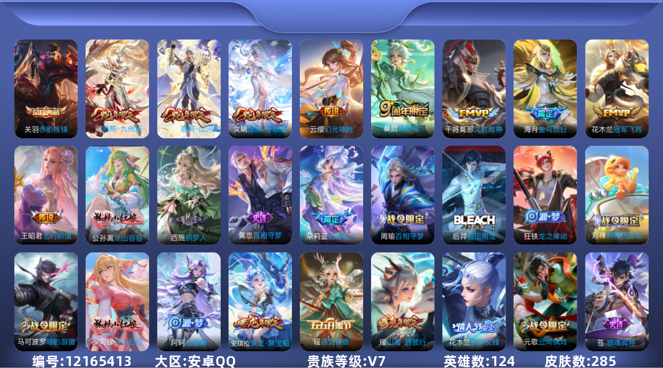 [12165413]V7 1典藏 9传说 124英雄 285皮肤 可修改实名 优质装备:赤影疾锋,冠军飞将,久胜战神,乞巧织情,金乌负日,涂山容容 传说皮:幻光神枪 珍宝阁皮:妄想食味,万物之道 限定皮:愿照·九州拓(澜年限),愿照·山河定(司空震年限),愿照·千秋盛(女娲年限),鸣野蒿,寅虎·展翼(孙膑年限),时之彼端,飞衡(韩信年限),山海·碧波行(瑶年限),游园惊梦,虎魄,天狼征服者,李小龙,如梦令-后羿,霸王别姬-虞姬,默契交锋-花木兰,神器·万象笔 史诗皮:鸭鸭历险记-刘禅,器灵·浮梦炉,狼魂孤将,化蝶舞,星界战将,谪仙醉月,龙之律动,石田雨龙,百相守梦-周瑜,茶境仙,幻珠鲛人,怒海争锋,炽弈燎原,撼地雄心,破空之剑,涂山红红,蒙犽顽岩魄,芈月浮光幕影,琥珀纪元伽罗,蔬乡物语(鲁班七号),乘龙·聚宝船(安琪拉年限),乘龙·忆丹青(大乔年限),百相守梦-百里守约,星界特工,百相守梦-黄忠,织梦人,遇见神鹿,紫霞仙子,电玩小子(小书包),特工魅影,千年之狐,江河有灵,雪夜绮愿(周瑜),百解令(蒙犽),蒙恬荣光圣徽,冰冠公主,青蛇,偶像歌手,末日机甲-吕布,猫狗日记-大乔,时之恋人-孙尚香,乱世虎臣,节奏热浪,女仆咖啡,摇滚巨星,水果甜心,绅士熊喵,星夜王子,心灵骇客,幽灵船长,鬼剑武藏,舞动绿茵,地狱岩魂,纤云弄巧,繁星吟游(呼啦呼啦),拒霜思,缤纷独角兽,月团寄思,曙光守护者,箭羽风息,金属风暴,原初追逐者,圣诞狂欢,圣诞恋歌,鹰眼统帅,暗夜贵公子,黎明之约,未来纪元-赵云