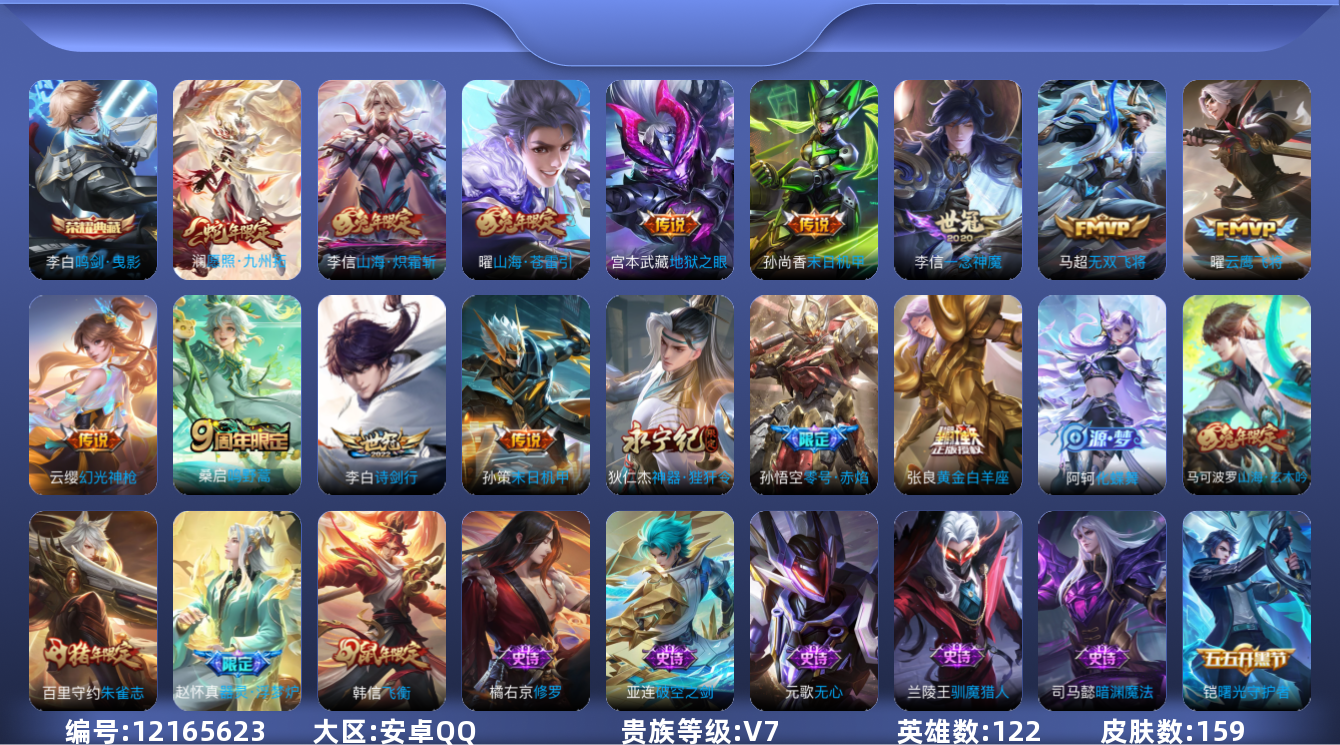 - PX_2095512-实名: 不可修改 性别: 男号 贵族等级: V7 英雄数: 123 皮肤数: 267 荣耀水晶: 最初的交响 无双皮: 器灵·螭龙剑 传说皮: 云鹰飞将,黄金白羊座,炽阳神光,末日机甲-孙尚香,琥珀纪元马超 限定皮: 遇见飞天,李小龙,天狼溯光者,神威,飞衡,梅西,默契交锋-花木兰,高山流水,匿光追影者,傲雪梅枪,寅虎·心曲,五谷丰年,鸣野蒿,陌上桑,映山客,愿照·岁时盈,愿