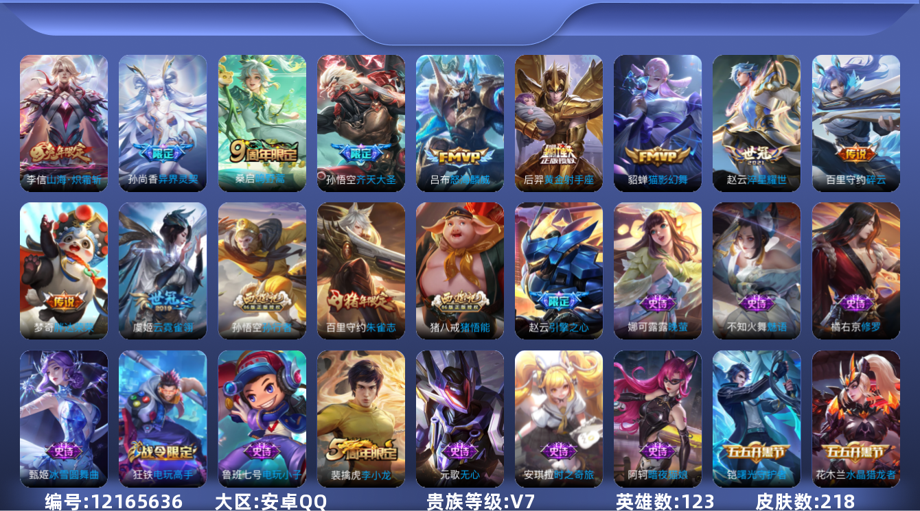 [12165636]V7 11传说 123英雄 218皮肤 可修改实名 优质装备:黄金射手座,猫影幻舞,云霓雀翎,胖达荣荣,淬星耀世,碎云,山海·炽霜斩(李信年限) 珍宝阁皮:万物之道,玩趣恶龙 限定皮:鸣野蒿,异界灵契(白毛香),高山流水,齐天大圣,怒海麟威,游园惊梦,梁祝,李小龙,朱雀志(守约年限),孙行者,猪悟能,引擎之心,寅虎·御盾(廉颇年限),百木心枪 史诗皮:芈月浮光幕影,苍穹之光,电玩小子(小书包),特工魅影,千年之狐,魅语,百解令(蒙犽),无限星赏官,冰冠公主,晚萤,暗夜猫娘,末日机甲-吕布,猫狗日记-孙策,猫狗日记-大乔,节奏热浪,修罗,女仆咖啡,摇滚巨星,水果甜心,星夜王子,心灵骇客,时之奇旅-安琪拉,功夫厨神,暗隐猎兽者,鬼剑武藏,心灵战警,地狱岩魂,繁星吟游(呼啦呼啦),拒霜思,缤纷独角兽,乘风破浪,逐浪之夏,水晶猎龙者,曙光守护者,金属风暴,圣诞恋歌,鹰眼统帅,暗夜贵公子,魅力维加斯,雪上飞焰,寅虎·御盾,无心,未来纪元-赵云