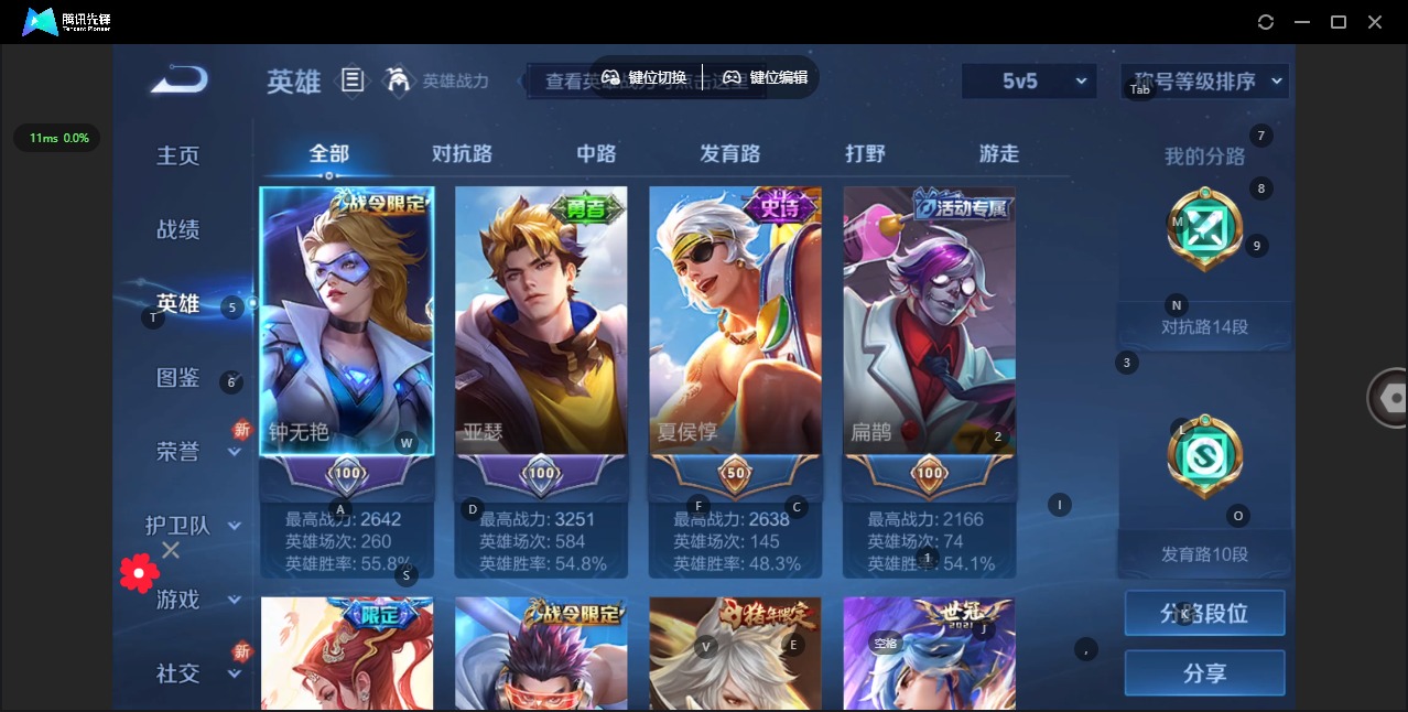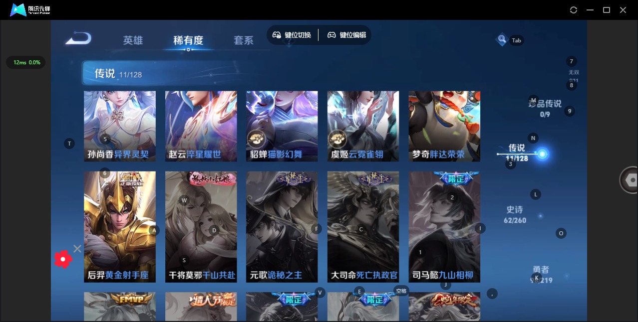 - [36855]英雄数: 124 勇者皮肤数: 109 史诗皮肤数: 33 传说皮肤数: 1 稀有英雄: 嬴政,韩信,夏洛特,艾琳,橘右京,娜可露露,不知火舞,赵云,金蝉,桑启,戈娅 当前段位: 铂金 限定皮肤: 遇见飞天,李小龙,游园惊梦,高山流水,猪悟能,五谷丰年 内测皮肤: 优雅恋人,女武神 史诗皮肤: 偶像歌手,冰冠公主,逐浪之夏,节奏热浪,摇滚巨星,水果甜心,天才门将,德古拉伯爵,暗隐猎兽者,鬼剑武藏,舞动绿茵,繁星吟游,缤纷独角兽,水晶猎龙者,曙光守护者,金属风暴,圣诞恋歌,热浪节奏(弃用),时之奇旅,拒霜思 赛季/战令皮肤: 疑决卦,醍醐杖,原初探秘者,万华元夜,演武夺筹,驱傩正仪,千军破阵,圣弓游侠,真爱魔法,沙漠行僧,金庭之子,大漠名商,云中旅人,海盐诗旅 普通皮肤: 五福同心,龙腾万里,花好人间,归虚梦演(蒙犽),归虚梦演(孙膑),归虚梦演(曜),海滩派对,海滩丽影,沉稳之力,守护之力,坚韧之力,敏锐之力,化身博士,炽热元素使,缤纷绘卷,纽约教父,特工战影,圆桌骑士(盾山),乓乓大师,万象初新,黄金武士,次元突破,大发明家,功夫老勺,鲨炮海盗猫,红桃皇后,教廷特使,阴阳师,汉昭烈帝,兔女郎,死亡骑士,少女阿狸,忍·炎影,丁香结,白执事,奇妙博物学,秘密基地,爱心护理,紫罗兰之誓,白色死神,野性能量,冰雪圆舞曲,铁甲之心,未来纪元(宫本武藏),拳王,玩偶对对碰,瓷语鉴心,街头霸王,制霸全明星,次元傲视,幻乐之宴,虹云星官,重装意志,圆桌骑士(太乙真人),孤猎,露花倒影,修竹墨客,幸存者,荷鲁斯之眼,冰刃幻境,伊势巫女,花见巫女,踏雪寻梅,未来旅行,三太子,龙域领主,第七人偶,地府判官,埃及法老,圣殿之光,生化警戒,金属狂潮,蔷薇王座,万圣前夜,异域舞娘,潮流仙人,东海龙王,星航指挥官,战争女神,激情绿茵,精灵王,加勒比小姐,死神来了,熊喵少女,芝加哥教父,赤焰之缨,美梦成真,启蛰,秩序猎龙将,森,创世神祝,年年有余,极冰防御线,魇语军师,海之征途,午夜歌剧院,精准探案法,街头旋风,霓裳曲,花间舞,绝影神枪,战争骑士,天启骑士,特种部队,范海辛,隐刃,绯红之刃,木偶奇遇记,西部大镖客(孙悟空),海军大将,帝国元帅,精灵公主,锦衣卫,一千零一夜,时尚教父,超能战警,英喵野望,前尘,碧珀绯影,无双福将,画中游,唤灵魔甲,契约魔法,蔚蓝守将,潮玩探月行