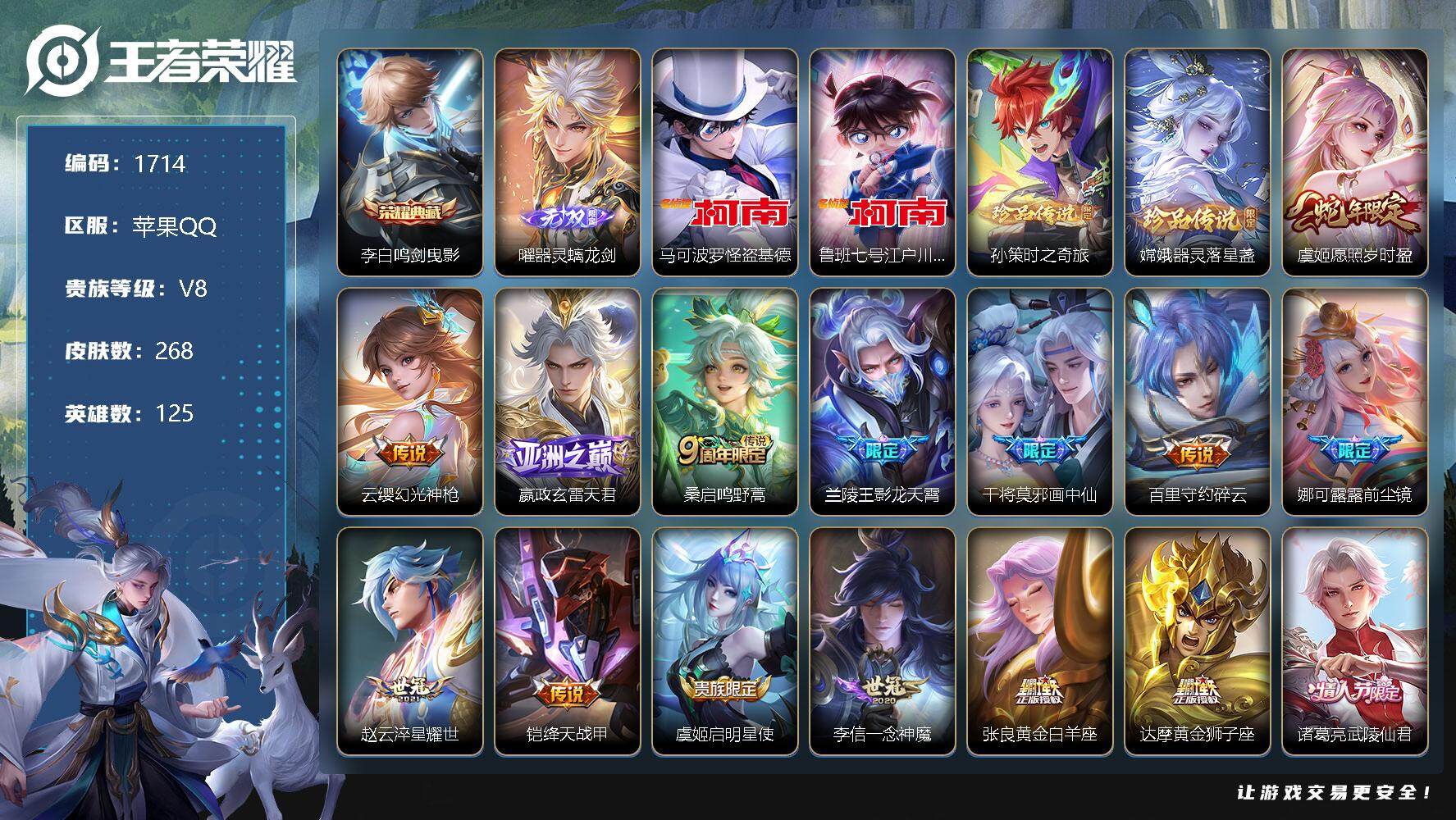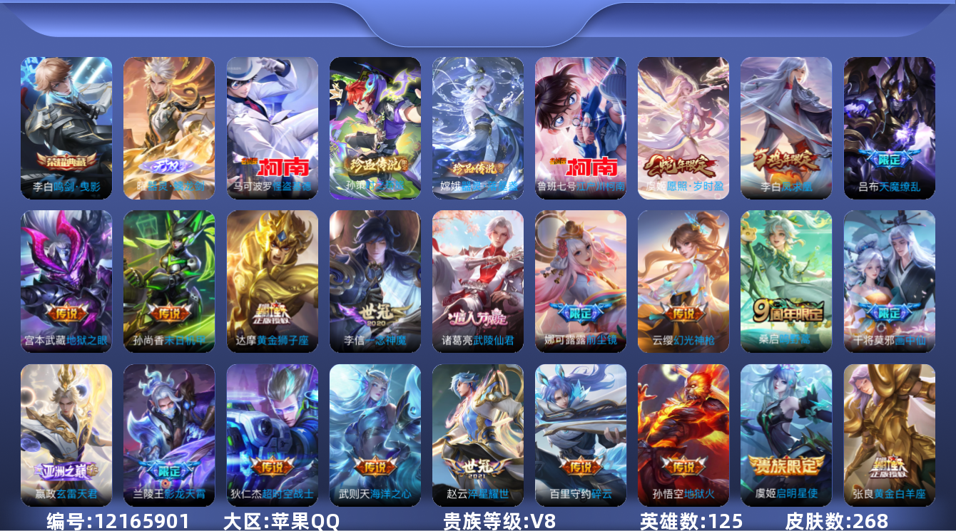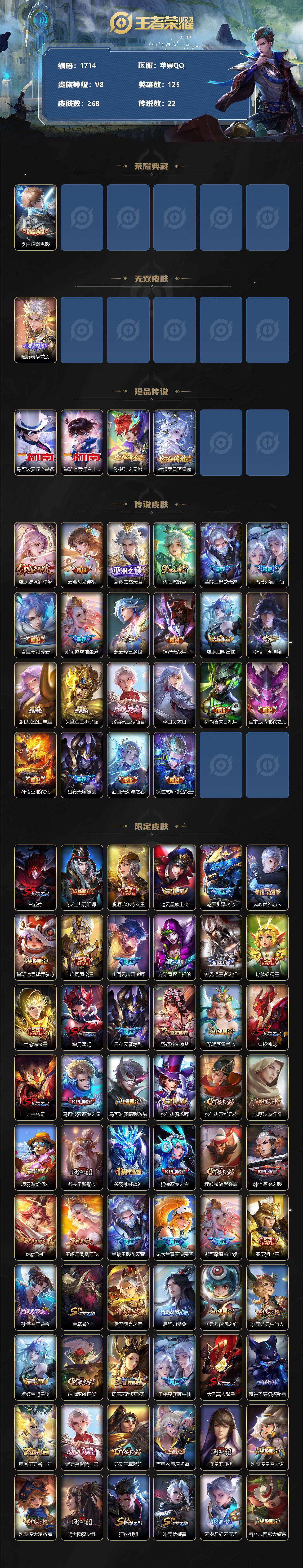 [12165901]【商品标题】:苹果Q-V8-永恒钻石II段位-125英雄-268皮肤-1典藏-0珍品无双-1无双-4珍品传说-22传说-64史诗
