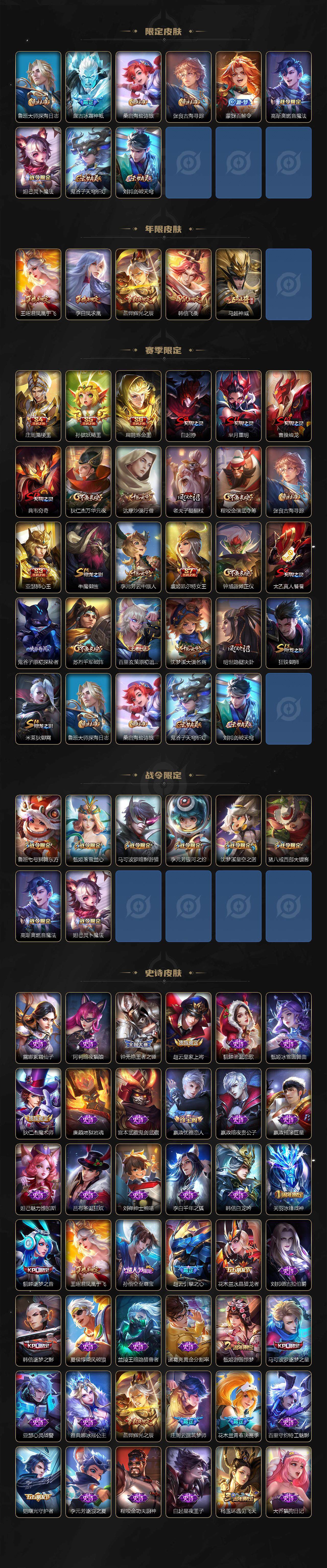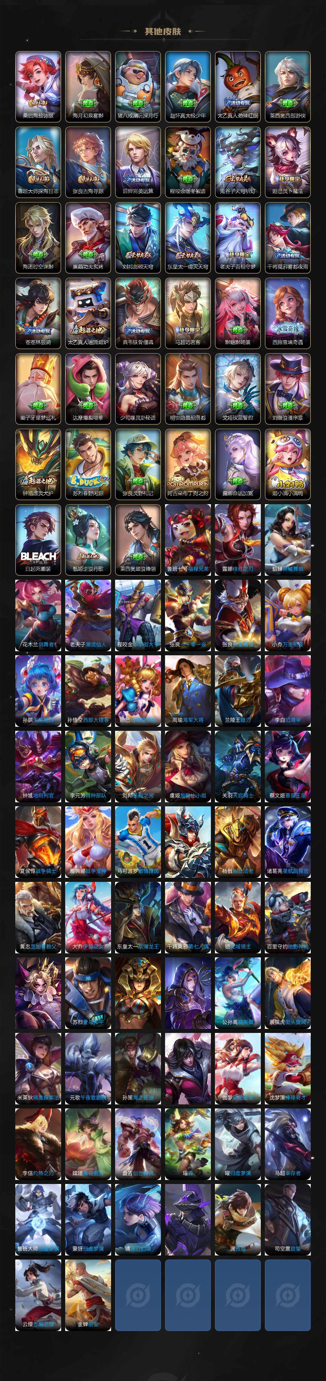 【限定皮肤】:白起狰,狄仁杰阴阳师,虞姬凯尔特女王,赵云皇家上将,赵云引擎之心,嬴政优雅恋人,鲁班七号狮舞东方,庄周蜃楼王,庄周云端筑梦师,高渐离死亡摇滚,钟无艳王者之锤,孙膑妖精王,扁鹊炼金王,芈月重明,吕布天魔缭乱,甄姬游园惊梦,甄姬落雪兰心,曹操烛龙,典韦穷奇,马可波罗逐梦之星,马可波罗暗影游猎,狄仁杰魔术师,狄仁杰万华元夜,达摩沙漠行僧,项羽海滩派对,老夫子醍醐杖,关羽冰锋战神,貂蝉逐梦之音,程咬金演武夺筹,韩信逐梦之影,韩信飞衡,王昭君凤凰于飞,兰陵王影龙天霄,花木兰青春决赛季,娜可露露前尘镜,亚瑟狮心王,孙悟空至尊宝,牛魔御旌,后羿辉光之辰,后羿如梦令,李元芳银河之约,李元芳云中旅人,虞姬启明星使,钟馗驱傩正仪,杨玉环遇见飞天,干将莫邪画中仙,太乙真人饕餮,鬼谷子原初探秘者,鬼谷子五谷丰年,诸葛亮武陵仙君,苏烈千军破阵,百里玄策原初追逐者,弈星混沌棋,沈梦溪星空之诺,沈梦溪大漠名商,明世隐疑决卦,狂铁御狮,米莱狄御霄,云中君纤云弄巧,猪八戒西部大镖客,鲁班大师探海日志,盘古冰霜神祇,桑启海盐诗旅,张良古海寻踪,蒙犽百解令,高渐离燃音魔法,妲己灵卜魔法,鬼谷子天穹祈灯,刘邦剑破天穹