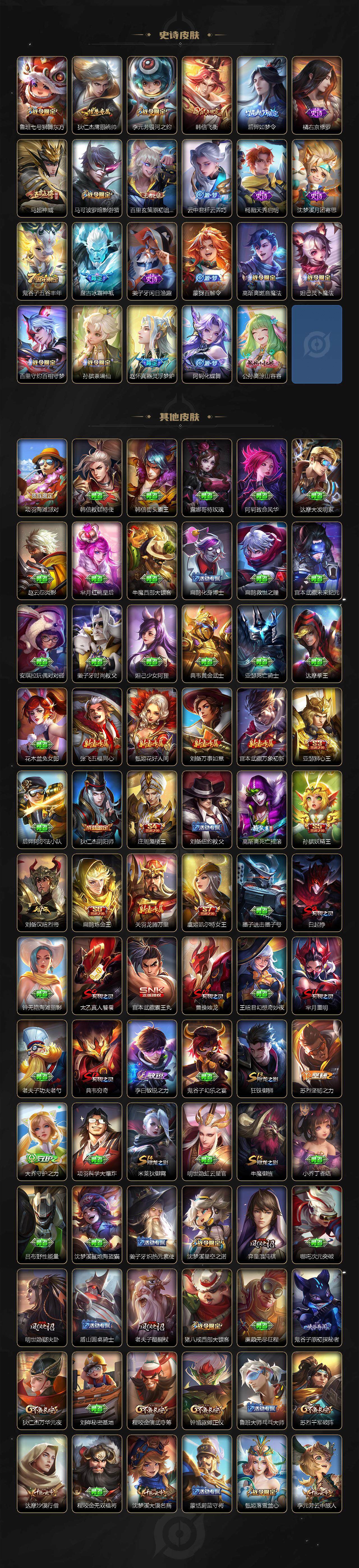 亚瑟狮心王,庄周蜃楼王,孙膑妖精王,扁鹊炼金王,虞姬凯尔特女王,白起狰,太乙真人饕餮,曹操烛龙,芈月重明,典韦穷奇,狂铁御狮,米莱狄御霄,牛魔御旌,明世隐疑决卦,老夫子醍醐杖,鬼谷子原初探秘者,狄仁杰万华元夜,程咬金演武夺筹,钟馗驱傩正仪,苏烈千军破阵,鲁班七号狮舞东方,沈梦溪星空之诺,李元芳银河之约,马可波罗暗影游猎,弈星混沌棋,达摩沙漠行僧,沈梦溪大漠名商,李元芳云中旅人,桑启海盐诗旅,鲁班大师探海日志,张良古海寻踪