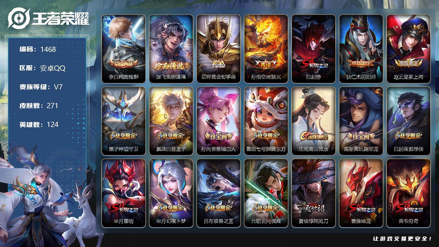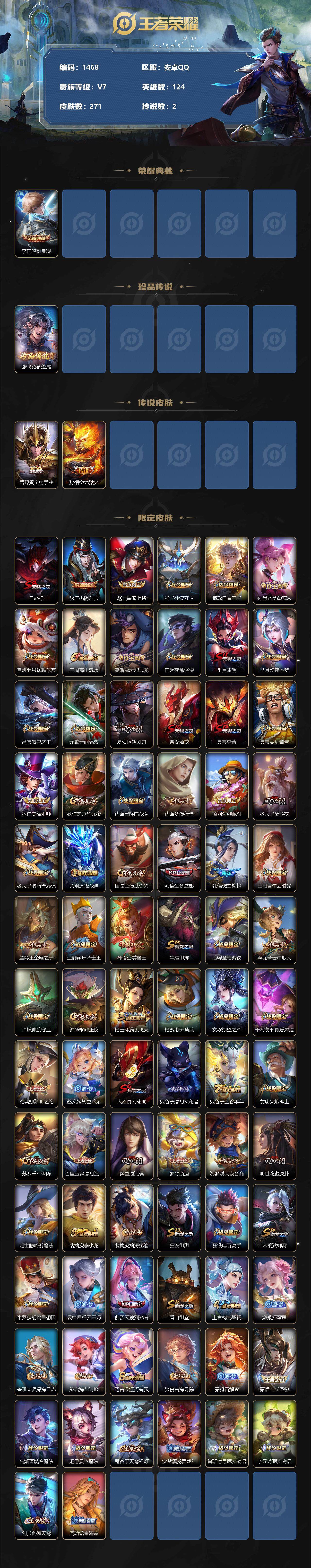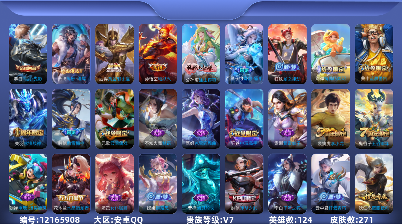 [12165908]【商品标题】:安卓Q-V7-至尊星耀IV段位-124英雄-271皮肤-1典藏-0珍品无双-0无双-1珍品传说-2传说-69史诗