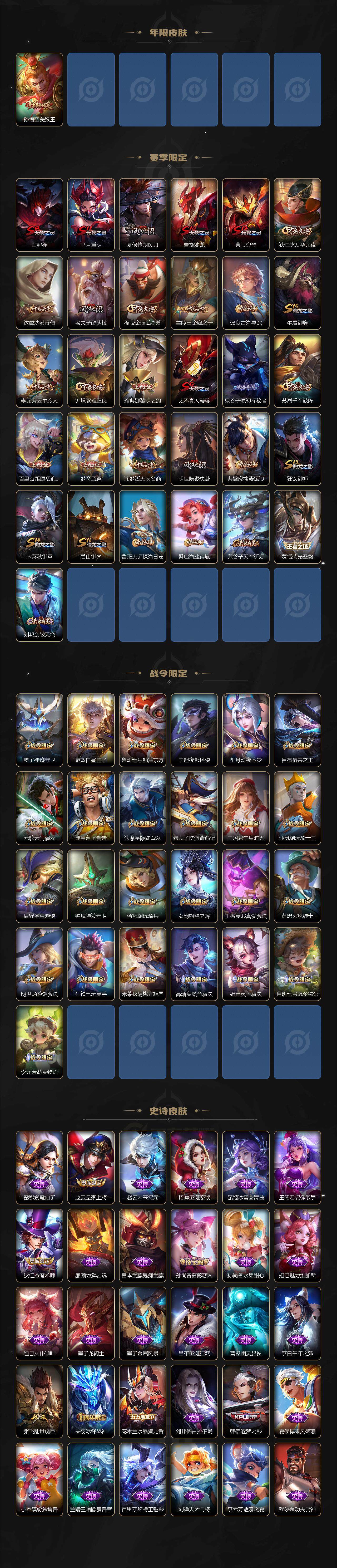【赛季限定】:白起狰,芈月重明,夏侯惇朔风刀,曹操烛龙,典韦穷奇,狄仁杰万华元夜,达摩沙漠行僧,老夫子醍醐杖,程咬金演武夺筹,兰陵王金庭之子,张良古海寻踪,牛魔御旌,李元芳云中旅人,钟馗驱傩正仪,雅典娜黎明之约,太乙真人饕餮,鬼谷子原初探秘者,苏烈千军破阵,百里玄策原初追逐者,弈星混沌棋,梦奇顽趣,沈梦溪大漠名商,明世隐疑决卦,裴擒虎擒涛扼浪,狂铁御狮,米莱狄御霄,盾山御銮,鲁班大师探海日志,桑启海盐诗旅,鬼谷子天穹祈灯,蒙恬荣光圣徽,刘邦剑破天穹