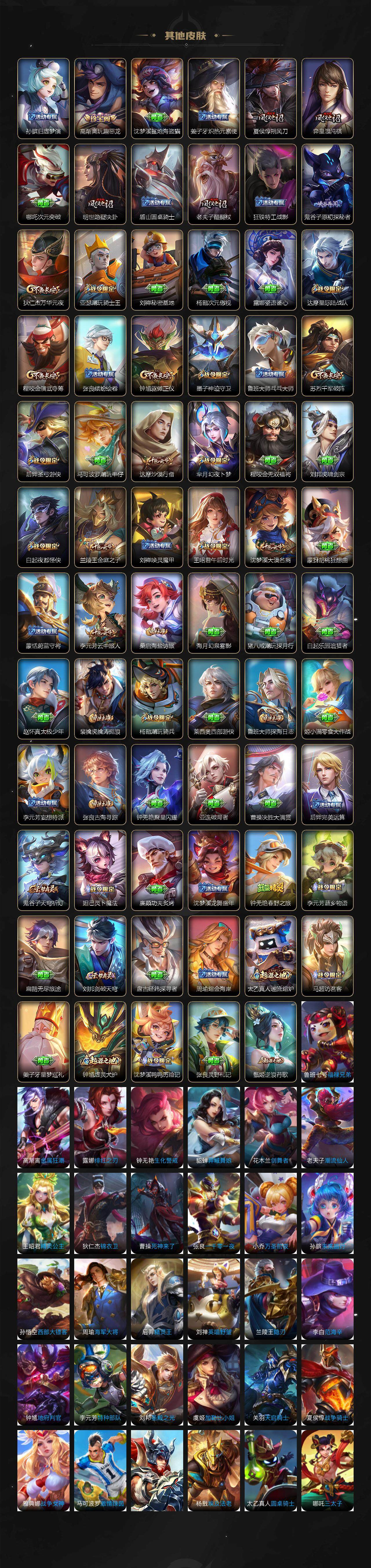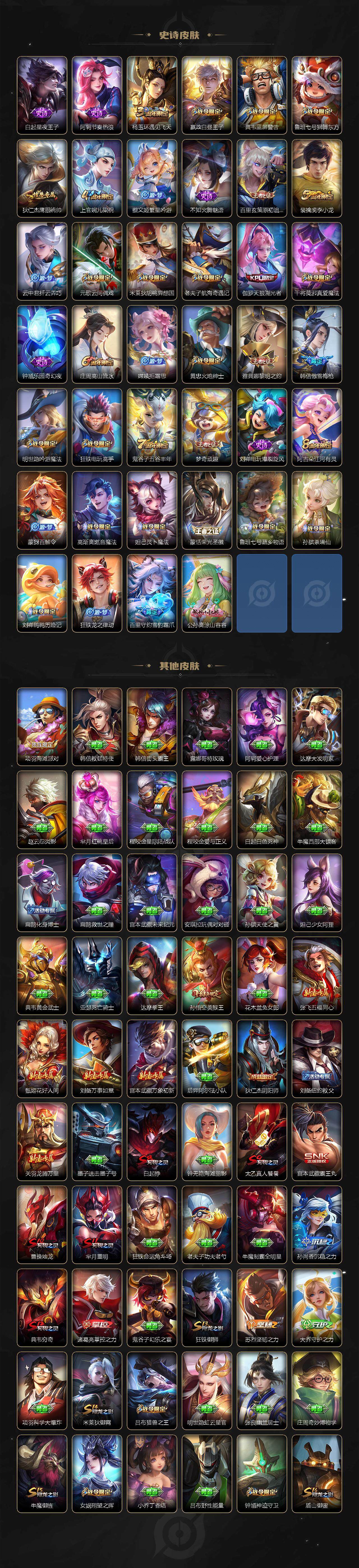 【限定皮肤】:白起狰,狄仁杰阴阳师,赵云皇家上将,墨子神迹守卫,嬴政白昼王子,孙尚香蔷薇恋人,鲁班七号狮舞东方,庄周高山流水,高渐离玩趣恶龙,白起夜都怪侠,芈月重明,芈月幻夜卜梦,吕布猎兽之王,元歌云间偶戏,夏侯惇朔风刀,曹操烛龙,典韦穷奇,典韦蓝屏警告,狄仁杰魔术师,狄仁杰万华元夜,达摩星际陆战队,达摩沙漠行僧,项羽海滩派对,老夫子醍醐杖,老夫子航海奇遇记,关羽冰锋战神,程咬金演武夺筹,韩信逐梦之影,韩信傲雪梅枪,王昭君午后时光,兰陵王金庭之子,亚瑟潮玩骑士王,孙悟空美猴王,牛魔御旌,后羿圣弓游侠,李元芳云中旅人,钟馗神迹守卫,钟馗驱傩正仪,杨玉环遇见飞天,杨戬潮玩骑兵,女娲朔望之晖,干将莫邪真爱魔法,雅典娜黎明之约,蔡文姬繁星吟游,太乙真人饕餮,鬼谷子原初探秘者,鬼谷子五谷丰年,黄忠火炮绅士,苏烈千军破阵,百里玄策原初追逐者,弈星混沌棋,梦奇顽趣,沈梦溪大漠名商,明世隐疑决卦,明世隐吟游魔法,裴擒虎李小龙,裴擒虎擒涛扼浪,狂铁御狮,狂铁电玩高手,米莱狄御霄,米莱狄胡桃异想国,云中君纤云弄巧,伽罗天狼溯光者,盾山御銮,上官婉儿梁祝,嫦娥拒霜思,鲁班大师探海日志,桑启海盐诗旅,阿古朵江河有灵,张良古海寻踪,蒙犽百解令,蒙恬荣光圣徽,高渐离燃音魔法,妲己灵卜魔法,鬼谷子天穹祈灯,沈梦溪龙舞盛年,鲁班七号蔬乡物语,李元芳蔬乡物语,刘邦剑破天穹,周瑜熔金海岸