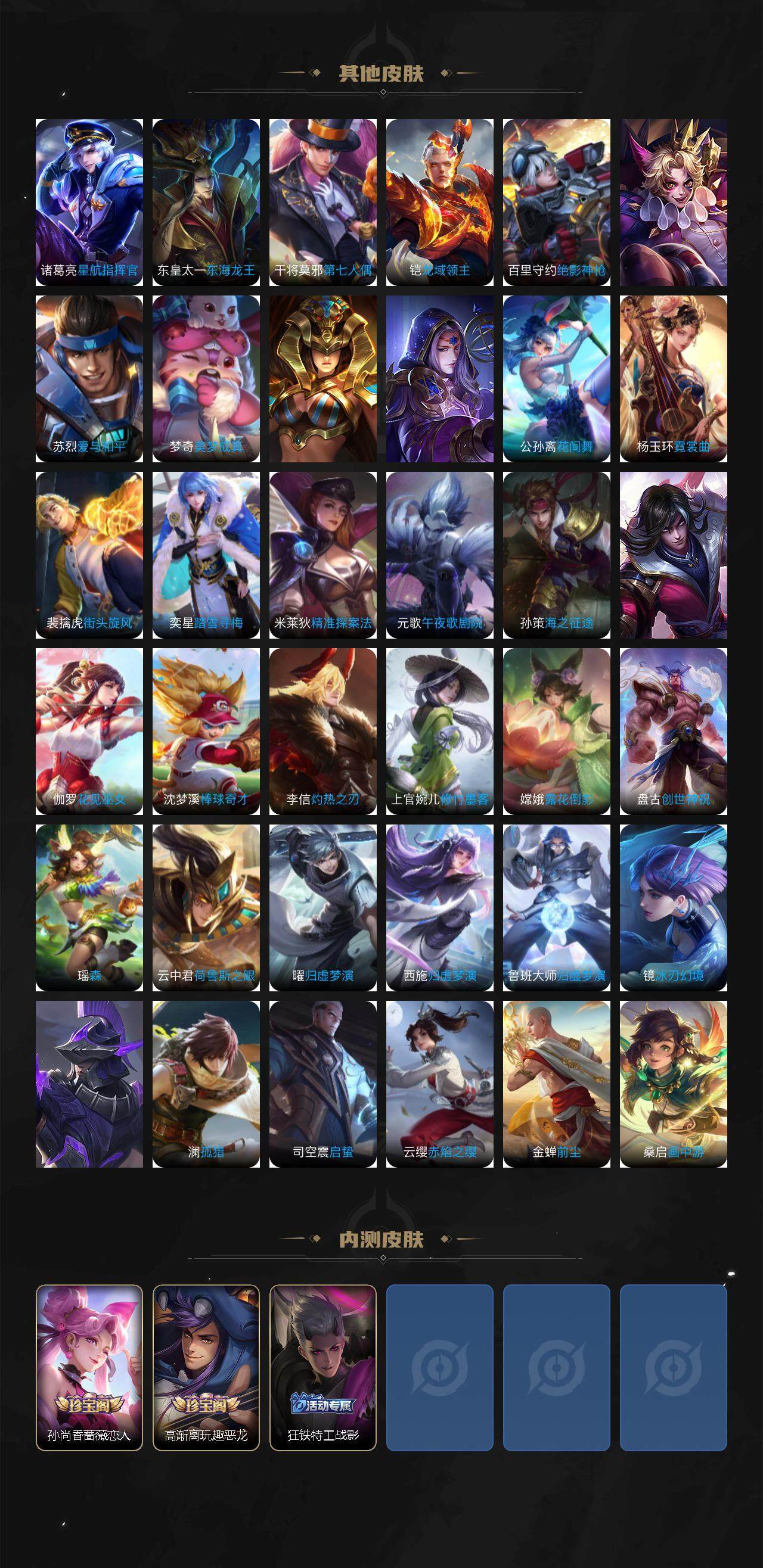 白起狰,太乙真人饕餮,曹操烛龙,芈月重明,典韦穷奇,狂铁御狮,米莱狄御霄,牛魔御旌,盾山御銮,夏侯惇朔风刀,明世隐疑决卦,老夫子醍醐杖,鬼谷子原初探秘者,狄仁杰万华元夜,程咬金演武夺筹,钟馗驱傩正仪,苏烈千军破阵,吕布猎兽之王,嬴政白昼王子,女娲朔望之晖,典韦蓝屏警告,钟馗神迹守卫,鲁班七号狮舞东方,元歌云间偶戏,弈星混沌棋,达摩沙漠行僧,兰陵王金庭之子,沈梦溪大漠名商,李元芳云中旅人,桑启海盐诗旅,裴擒虎擒涛扼浪,鲁班大师探海日志,张良古海寻踪