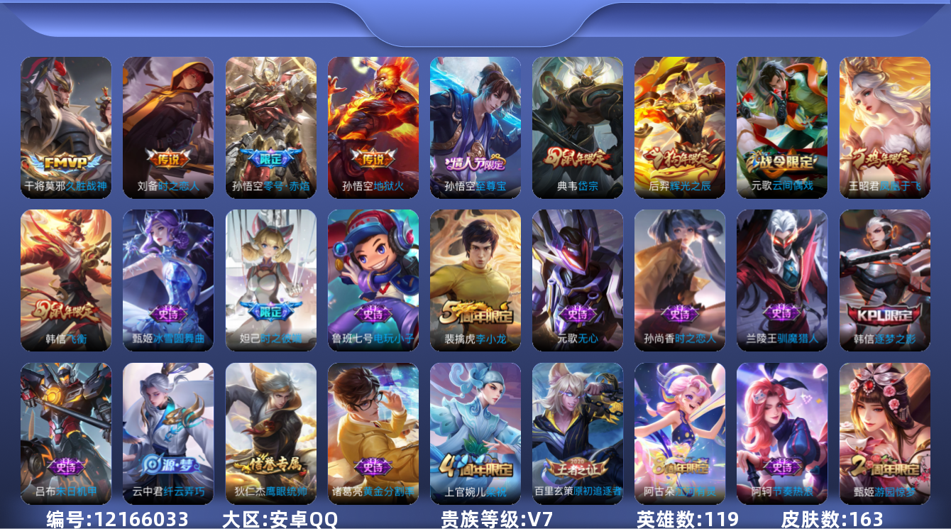 - PX_2086338-实名:,可修改,贵族等级:,V8,英雄数:,123,皮肤数:,361,荣耀水晶:,鸣剑·曳影,珍品传说:,怪盗基德,星传说:,幽冥火,传说皮:,云鹰飞将,炽阳神光,一念神魔,地狱火,时之恋人-刘备,超时空战士-狄仁杰,无双飞将,山海·炽霜斩,妄想实况,澜逐花归海,乘龙·铭钟鼎,吕布曦玄引,限定皮:,冰锋战神,遇见飞天,李小龙,梁祝,白晶晶,时之彼端,飞衡,青春决赛季,美猴王,