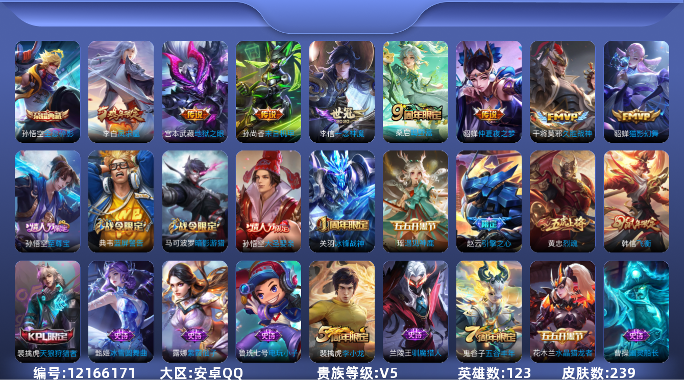 [12166171]【商品标题】:安卓Q-V5-尊贵铂金II段位-123英雄-239皮肤-1典藏-0珍品无双-0无双-0珍品传说-8传说-66史诗