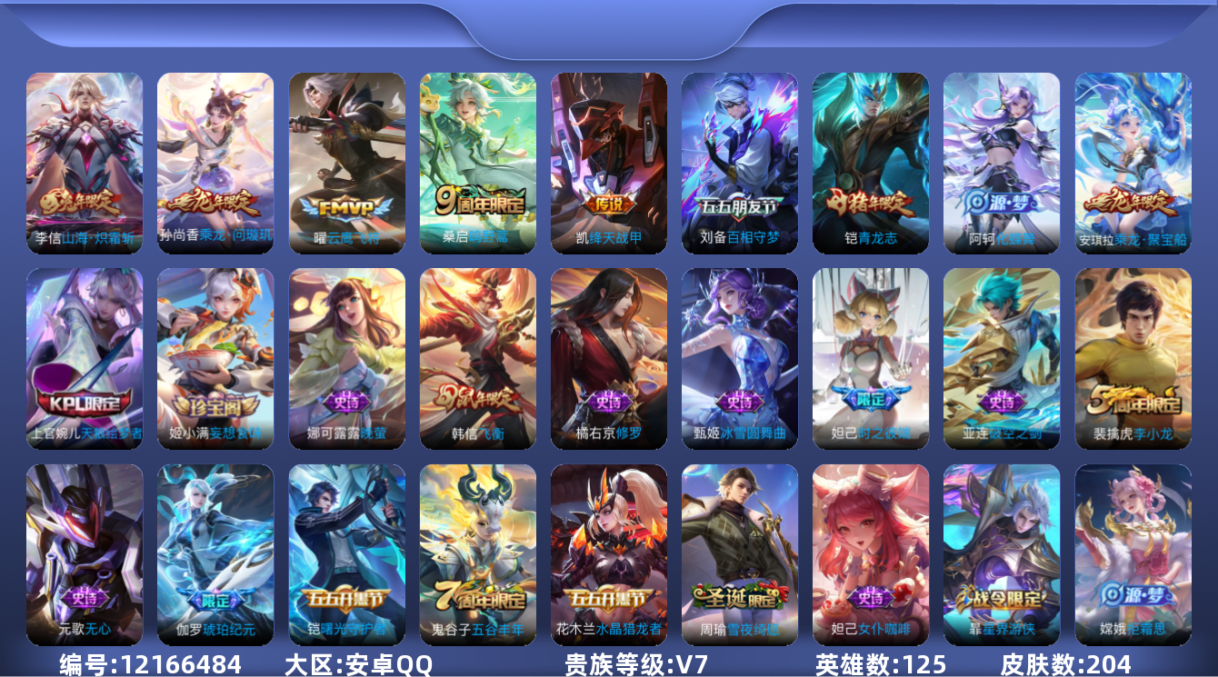 [12166484]V7 5传说 125英雄 204皮肤 可修改实名 优质装备:云鹰飞将(小将军),绛天战甲(鸡嘴战神),山海·炽霜斩(李信年限) 传说皮:乘龙·问璇玑(孙尚香年限) 珍宝阁皮:妄想食味,蔷薇恋人 限定皮:鸣野蒿,时之彼端,飞衡(韩信年限),高山流水,五谷丰年,青龙志(铠年限),游园惊梦,梁祝,天狼绘梦者,李小龙 史诗皮:化蝶舞,星界战将,破空之剑,战舞者,琥珀纪元伽罗,蔬乡物语(鲁班七号),乘龙·聚宝船(安琪拉年限),苍穹之光,黄金分割率,特工魅影,千年之狐,江河有灵,雪夜绮愿(周瑜),百解令(蒙犽),高渐离燃音魔法,偶像歌手,晚萤,百相守梦(刘备),猫狗日记-孙策,节奏热浪,修罗,女仆咖啡,摇滚巨星,水果甜心,星夜王子,心灵骇客,功夫厨神,德古拉伯爵,暗隐猎兽者,鬼剑武藏,心灵战警,舞动绿茵,地狱岩魂,纤云弄巧,拒霜思,缤纷独角兽,乘风破浪,水晶猎龙者,曙光守护者,金属风暴,圣诞狂欢,圣诞恋歌,鹰眼统帅,魅力维加斯,无心,未来纪元-赵云