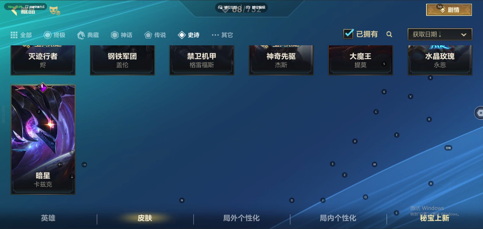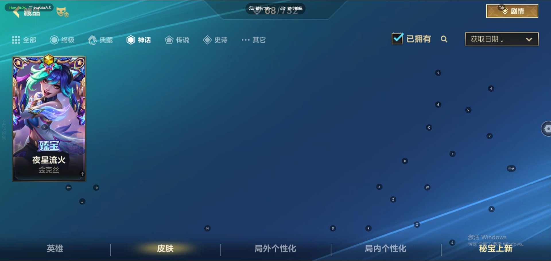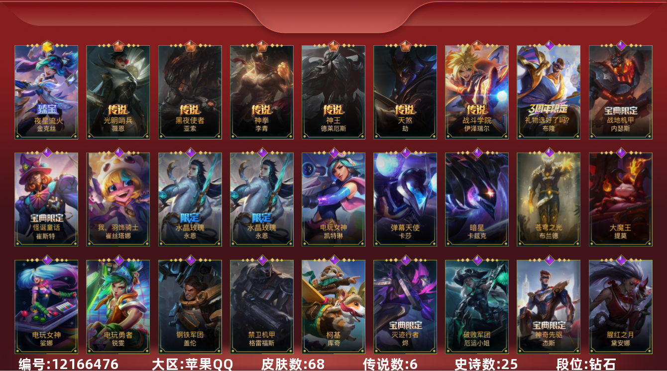 [12166476]1神话 1限定 6传说 25史诗 68皮肤 可二次 可修改实名 优质装备:光明哨兵薇恩,黑夜使者亚索,神拳盲僧,神王诺手,天煞劫,战斗学院ez 段位:钻石 神话皮:夜星流火 金克丝 限定皮肤:水晶玫瑰永恩