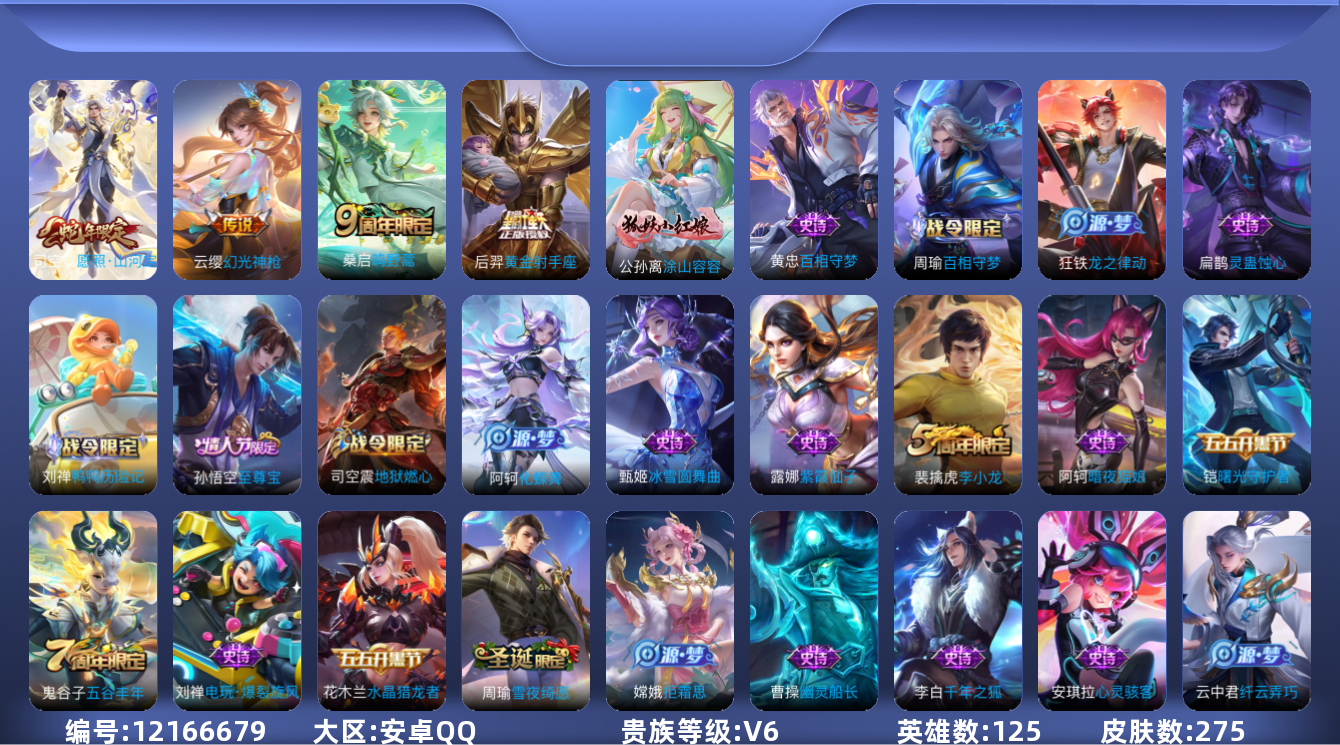 [12166679]V6 4传说 125英雄 275皮肤 可修改实名 优质装备:黄金射手座,涂山容容 传说皮:幻光神枪 珍宝阁皮:胡桃夹子,万物之道,蔷薇恋人 限定皮:愿照·山河定(司空震年限),逐霄战戟,鸣野蒿,至尊宝,遇见飞天,五谷丰年,梁祝,李小龙 史诗皮:鸭鸭历险记-刘禅,化蝶舞,灵蛊蚀心,星界战将,龙之律动,百相守梦-周瑜,百相守梦-黄忠,紫霞仙子,苍穹之光,黄金分割率,特工魅影,千年之狐,江河有灵,雪夜绮愿(周瑜),百解令(蒙犽),高渐离燃音魔法,蒙恬荣光圣徽,冰冠公主,偶像歌手,电玩·爆裂旋风,暗夜猫娘,猫狗日记-孙策,猫狗日记-大乔,乱世虎臣,节奏热浪,摇滚巨星,水果甜心,绅士熊喵,天才门将,星夜王子,心灵骇客,功夫厨神,暗隐猎兽者,幽灵船长,鬼剑武藏,心灵战警,天秀·启明,地狱岩魂,纤云弄巧,繁星吟游(呼啦呼啦),拒霜思,缤纷独角兽,乘风破浪,水晶猎龙者,曙光守护者,金属风暴,原初追逐者,圣诞狂欢,圣诞恋歌,鹰眼统帅,暗夜贵公子,魅力维加斯,黎明之约