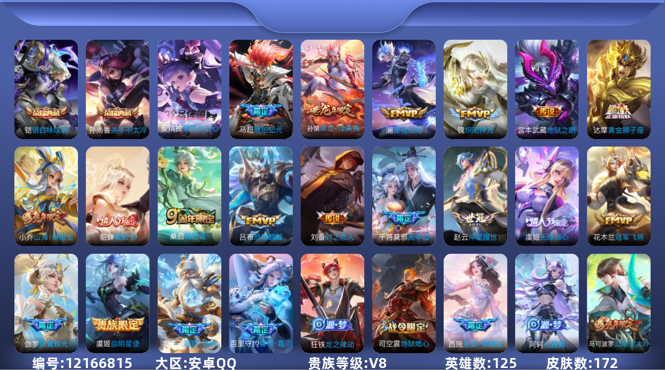 [12166815]【商品标题】:安卓Q-V8-最强王者段位-125英雄-172皮肤-2典藏-0珍品无双-0无双-1珍品传说-17传说-49史诗