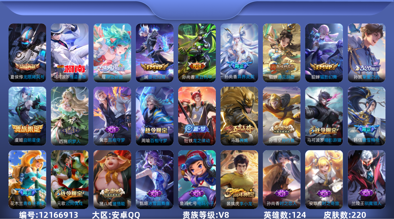 - [12241519]V8 12传说 124英雄 286皮肤 可修改实名 女号 优质装备:黄金狮子座,云鹰飞将(小将军),绛天战甲(鸡嘴战神),一念神魔,末日机甲-孙尚香(绿蚂蚱),地狱火,仲夏夜之梦(大飞蛾),地狱之眼,涂山容容 珍宝阁皮:万物之道,蔷薇恋人,玩趣恶龙 限定皮:逐霄战戟,鸣野蒿,时雨天司(水龙头),神威(电光马子),高山流水,五谷丰年,游园惊梦,梁祝,李小龙,默契交锋-兰陵王,默契交锋-花木兰,冰霜恋舞曲 史诗皮:化蝶舞,星界战将,龙之律动,百相守梦-黄忠,织梦人,紫霞仙子,电玩小子(小书包),黄金分割率,特工魅影,千年之狐,江河有灵,蒙恬荣光圣徽,偶像歌手,白蛇,电玩·爆裂旋风,龙骑士(小龙虾),末日机甲-吕布,猫狗日记-孙策,猫狗日记-大乔,时之恋人-孙尚香,乱世虎臣,节奏热浪,修罗,女仆咖啡,摇滚巨星,水果甜心,绅士熊喵,天才门将,星夜王子,心灵骇客,功夫厨神,德古拉伯爵,暗隐猎兽者,幽灵船长,鬼剑武藏,心灵战警,纤云弄巧,拒霜思,乘风破浪,逐浪之夏,水晶猎龙者,曙光守护者,热力回旋,金属风暴,圣诞狂欢,圣诞恋歌,鹰眼统帅,魅力维加斯,无心,未来纪元-赵云