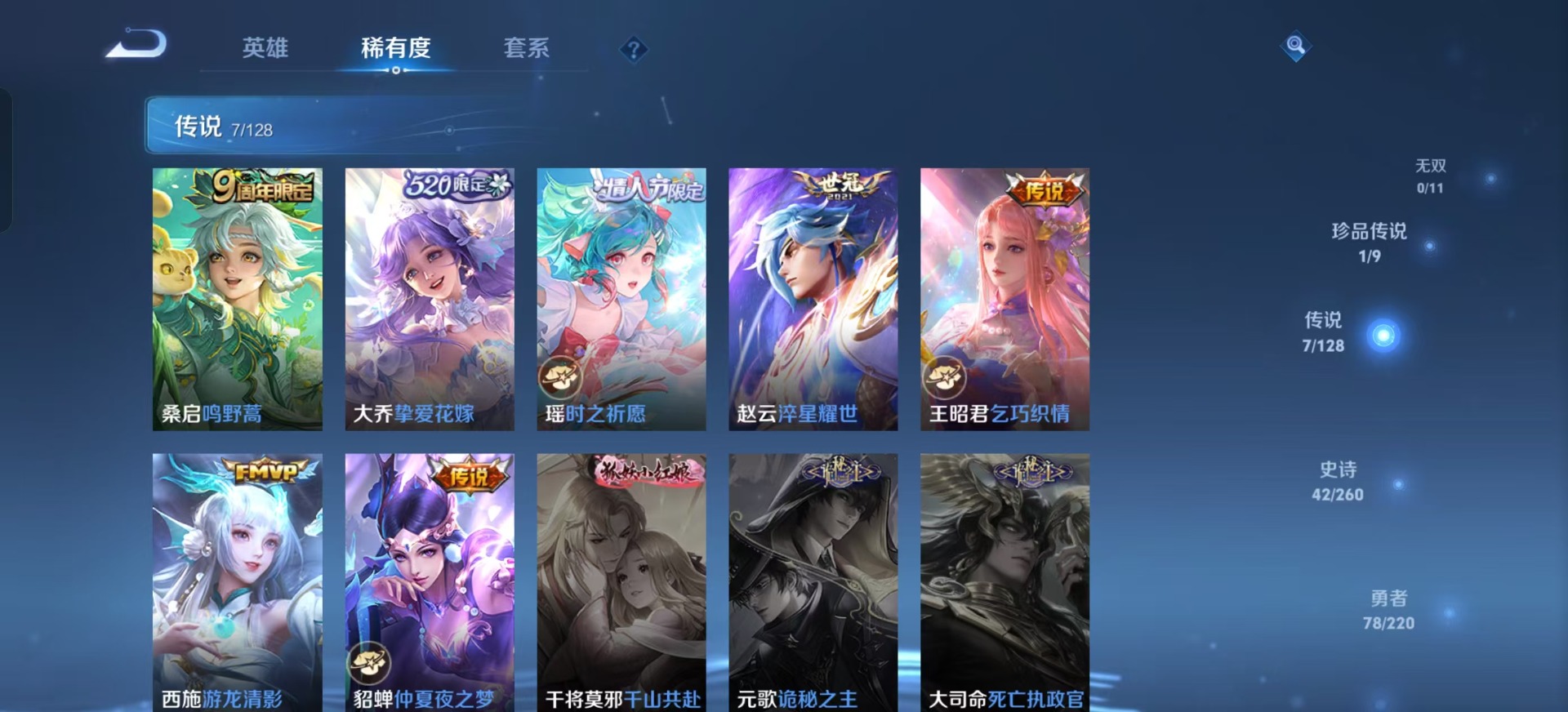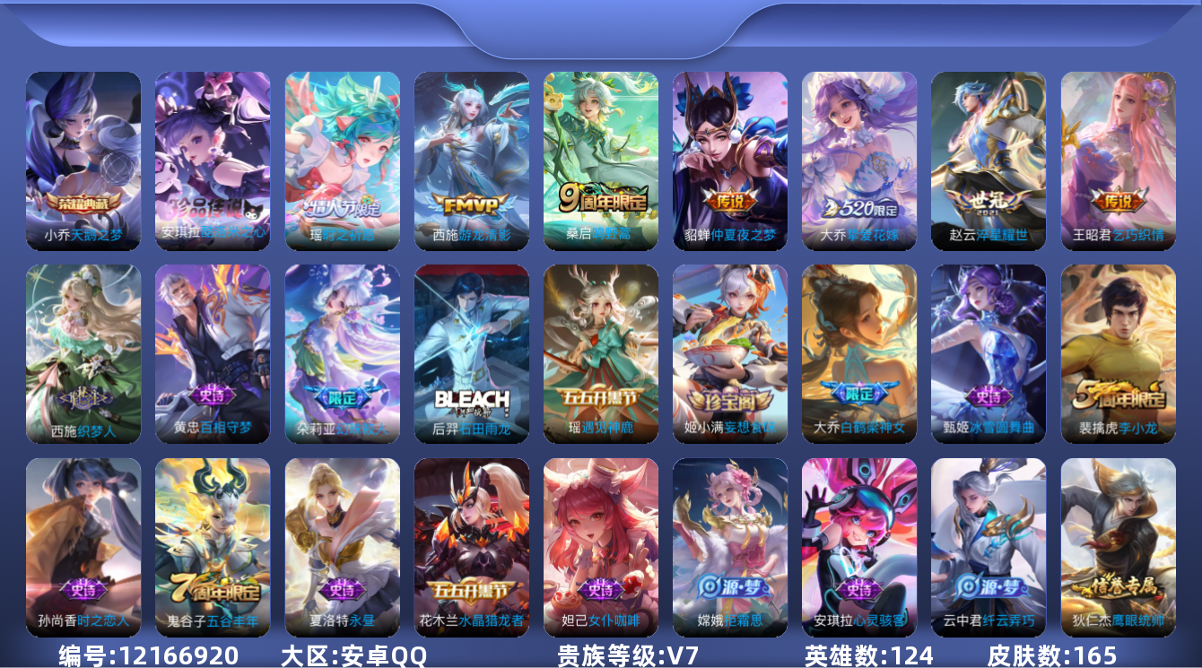 [12166920]V7 1典藏 1珍品传说 7传说 124英雄 165皮肤 可修改实名 优质装备:天鹅之梦(小乔典藏),酷洛米之心,仲夏夜之梦(大飞蛾),乞巧织情,游龙清影(小青龙),淬星耀世,挚爱花嫁 珍宝阁皮:妄想食味,蔷薇恋人 限定皮:鸣野蒿,白鹤梁神女,高山流水,五谷丰年,梁祝,天狼溯光者,李小龙,时之祈愿-瑶(瑶传限) 史诗皮:石田雨龙,幻珠鲛人,百相守梦-黄忠,织梦人,遇见神鹿,永昼,冰冠公主,白蛇,银翎春语,猫狗日记-孙策,猫狗日记-大乔,时之恋人-孙尚香,乱世虎臣,女仆咖啡,水果甜心,星夜王子,心灵骇客,德古拉伯爵,鬼剑武藏,纤云弄巧,繁星吟游(呼啦呼啦),拒霜思,缤纷独角兽,乘风破浪,水晶猎龙者,唤灵魅影,圣诞恋歌,鹰眼统帅,黎明之约,未来纪元-赵云