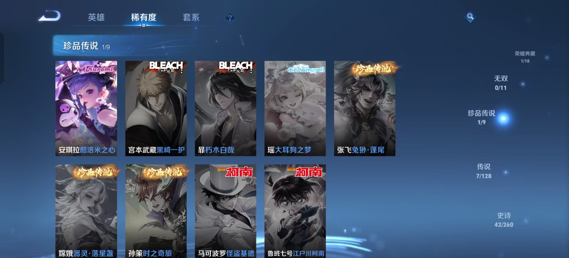 - [12116099]V8 1珍品传说 18传说 123英雄 242皮肤 可修改实名 优质装备:黑崎一护,黄金狮子座,云鹰飞将(小将军),猫影幻舞,炽阳神光,一念神魔,末日机甲-孙尚香(绿蚂蚱),李逍遥,时之恋人-刘备(电焊工),超时空战士-狄仁杰,无双飞将,浮生妄 传说皮:貂蝉曦玄引 珍宝阁皮:蔷薇恋人,女武神 限定皮:鸣野蒿,至尊宝,傲雪梅枪,补天,魔法小厨娘,时雨天司(水龙头),遇见飞天,诗剑行,五谷丰年,武圣,梁祝,御风骁将(吕布年限),天狼狩猎者,李小龙,如梦令-嫦娥,如梦令-后羿,圣诞老人,默契交锋-花木兰,大圣娶亲,冰霜恋舞曲,云端筑梦师,山海·玄木吟(马可年限) 史诗皮:鸭鸭历险记-刘禅,龙之律动,石田雨龙,紫霞仙子,黄金分割率,特工魅影,魅语,蒙恬荣光圣徽,冰冠公主,偶像歌手,猫狗日记-孙策,乱世虎臣,节奏热浪,女仆咖啡,水果甜心,天才门将,星夜王子,功夫厨神,鬼剑武藏,舞动绿茵,纤云弄巧,繁星吟游(呼啦呼啦),缤纷独角兽,乘风破浪,逐浪之夏,水晶猎龙者,曙光守护者,箭羽风息,金属风暴,原初追逐者,圣诞狂欢,圣诞恋歌,鹰眼统帅,黎明之约