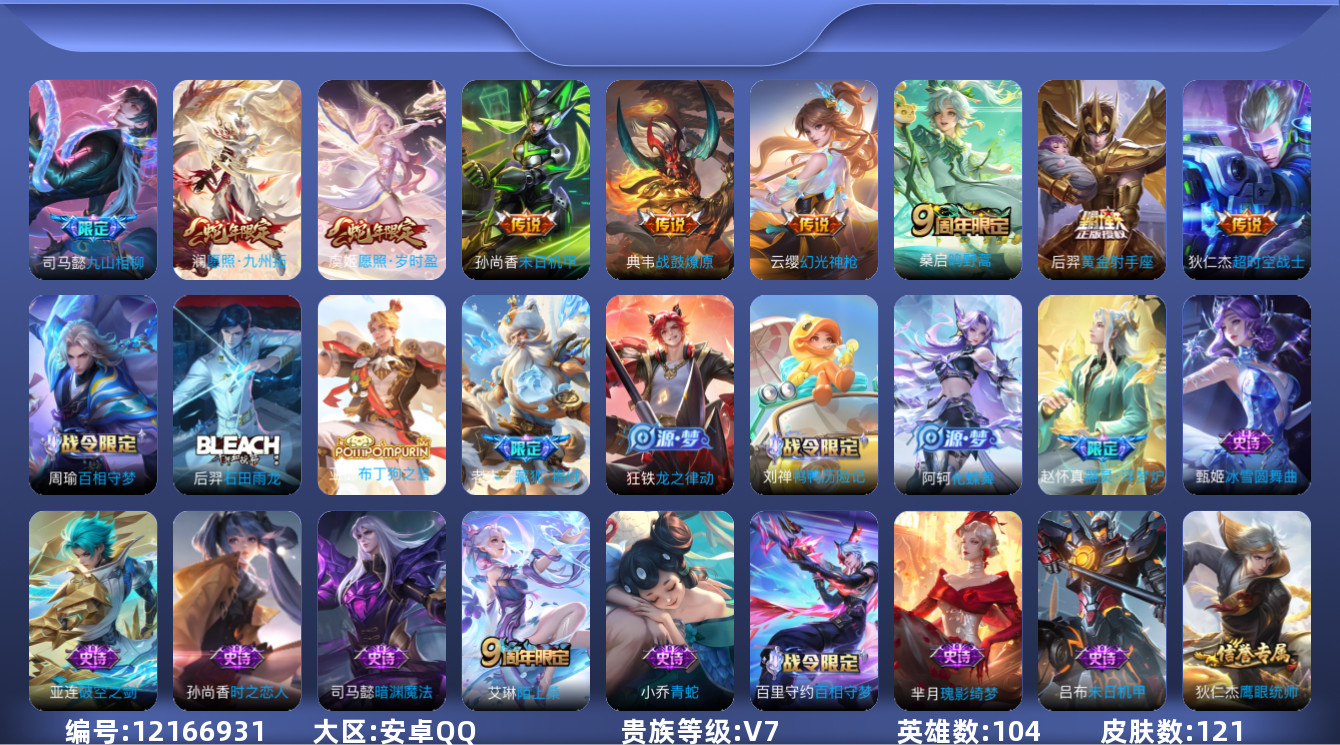 [12166931]V7 9传说 104英雄 121皮肤 可修改实名 优质装备:黄金射手座,末日机甲-孙尚香(绿蚂蚱),超时空战士-狄仁杰 传说皮:典韦战鼓燎原,九山相柳,幻光神枪 限定皮:愿照·九州拓(澜年限),愿照·岁时盈(虞姬年限),逐霄战戟,陌上桑,鸣野蒿 史诗皮:鸭鸭历险记-刘禅,器灵·浮梦炉,瑰影绮梦,化蝶舞,龙之律动,藏狐·褐绒,布丁狗之誓,石田雨龙,百相守梦-周瑜,茶境仙,撼地雄心,破空之剑,百相守梦-百里守约,特工魅影,青蛇,末日机甲-吕布,猫狗日记-孙策,时之恋人-孙尚香,摇滚巨星,水果甜心,星夜王子,暗隐猎兽者,鬼剑武藏,暗渊魔法,心灵战警,舞动绿茵,逐浪之夏,箭羽风息,圣诞狂欢,圣诞恋歌,鹰眼统帅,魅力维加斯
