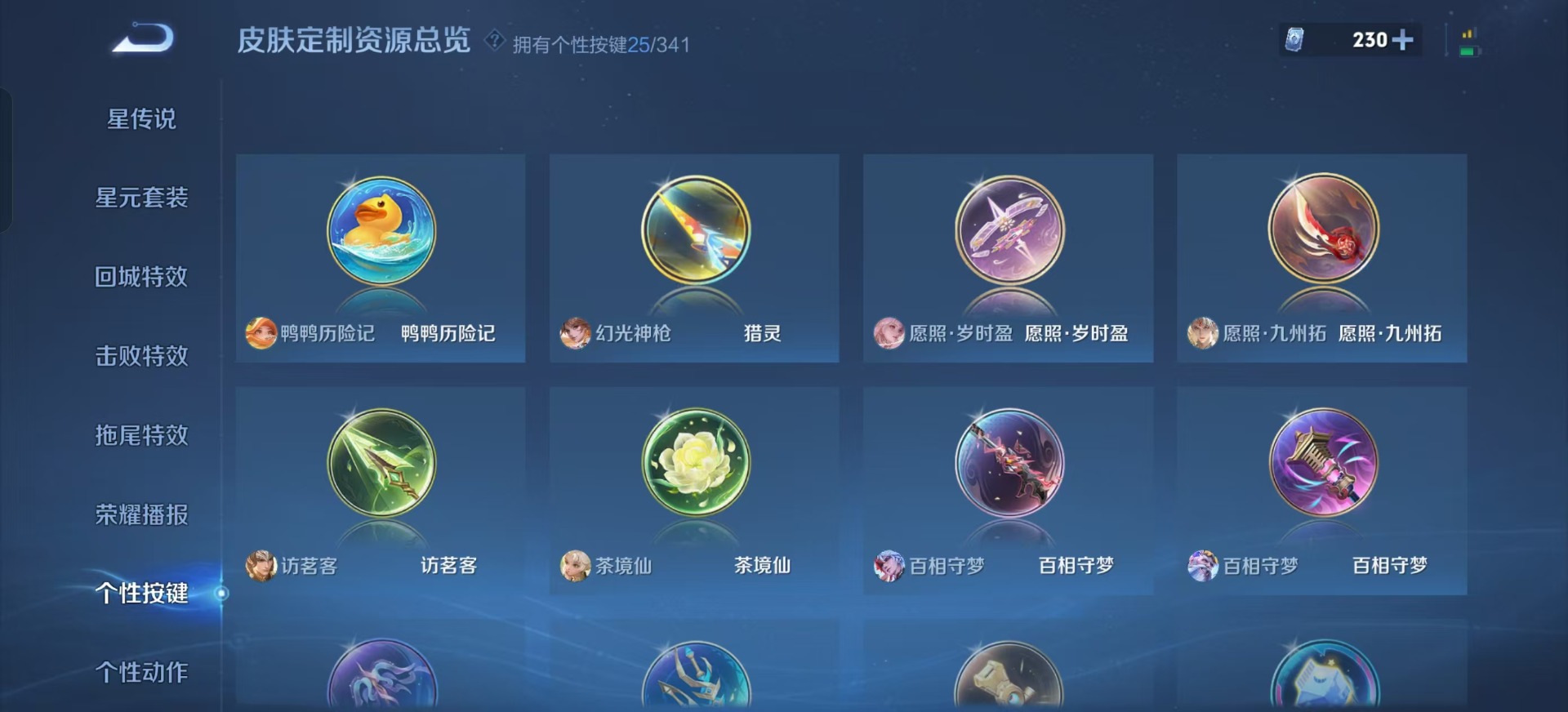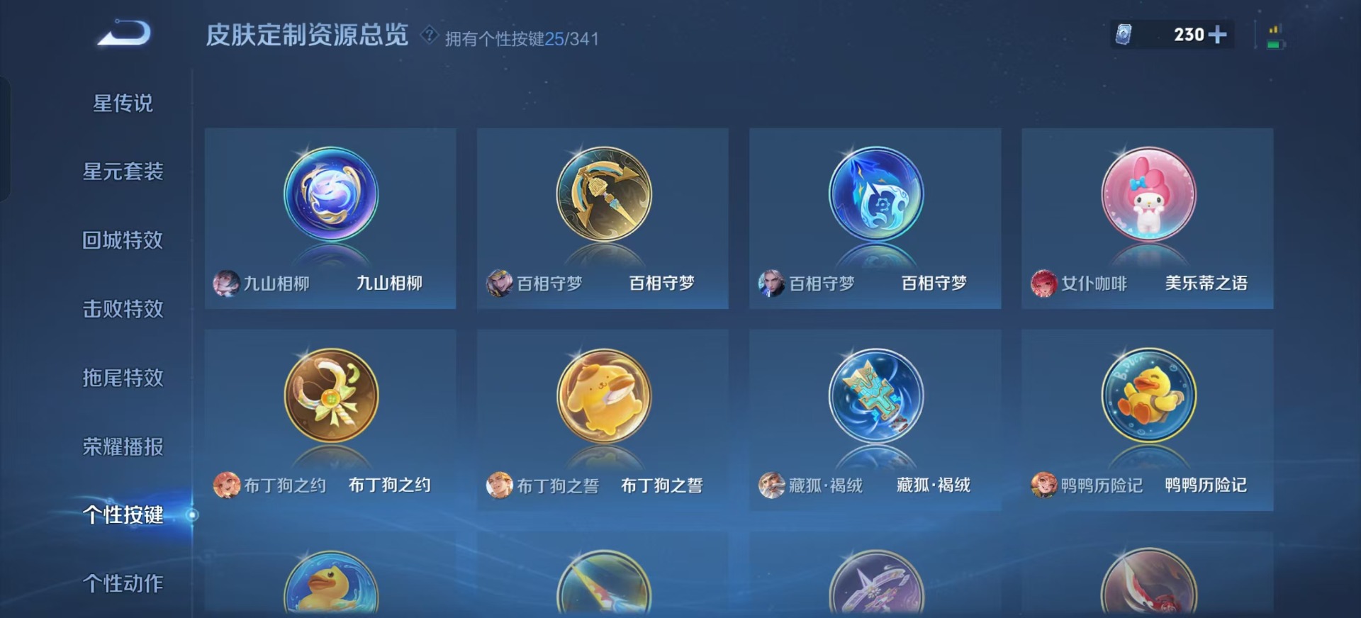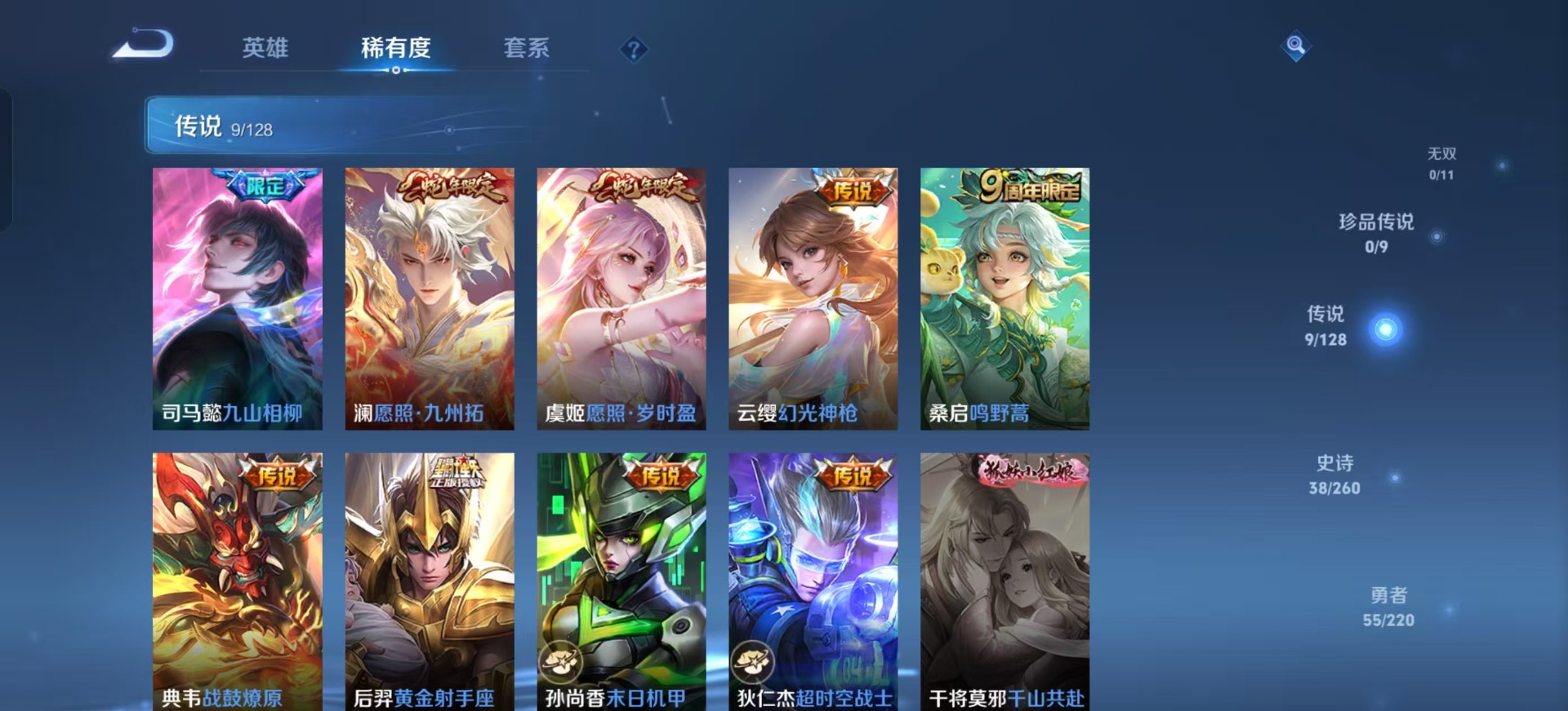 宫本武藏鬼剑武藏,兰陵王暗隐猎兽者,貂蝉圣诞恋歌,白起星夜王子,伽罗箭羽风息,亚瑟心灵战警,嬴政摇滚巨星,小乔青蛇,孙尚香时之恋人,孙策猫狗日记,赵怀真器灵·浮梦炉,百里守约特工魅影,李元芳逐浪之夏,吕布圣诞狂欢,吕布末日机甲,蔡文姬舞动绿茵,司马懿暗渊魔法