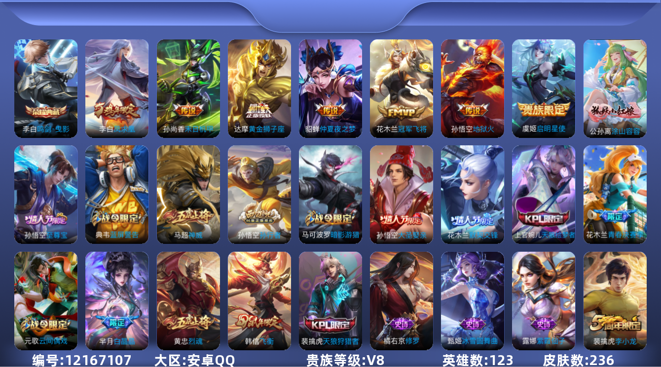 [12167107]V8 1典藏 7传说 123英雄 236皮肤 可修改实名 优质装备:鸣剑·曳影,黄金狮子座,冠军飞将,末日机甲-孙尚香(绿蚂蚱),地狱火,仲夏夜之梦(大飞蛾),涂山容容 珍宝阁皮:女武神 限定皮:至尊宝,凤求凰(白切鸡),白晶晶,神威(电光马子),飞衡(韩信年限),瑞麟志(木兰年限),遇见飞天,梁祝,天狼狩猎者,逐梦之星,烈魂,天狼征服者,天狼绘梦者,李小龙,逐梦之影,默契交锋-花木兰,孙行者,大圣娶亲,青春决赛季,美猴王 史诗皮:紫霞仙子,白龙吟,黄金分割率,千年之狐,无限星赏官,龙骑士(小龙虾),猫狗日记-孙策,乱世虎臣,修罗,女仆咖啡,水果甜心,天才门将,功夫厨神,德古拉伯爵,暗隐猎兽者,幽灵船长,鬼剑武藏,纤云弄巧,繁星吟游(呼啦呼啦),拒霜思,缤纷独角兽,逐浪之夏,水晶猎龙者,热力回旋,金属风暴,原初追逐者,圣诞狂欢,圣诞恋歌,鹰眼统帅,魅力维加斯,黎明之约