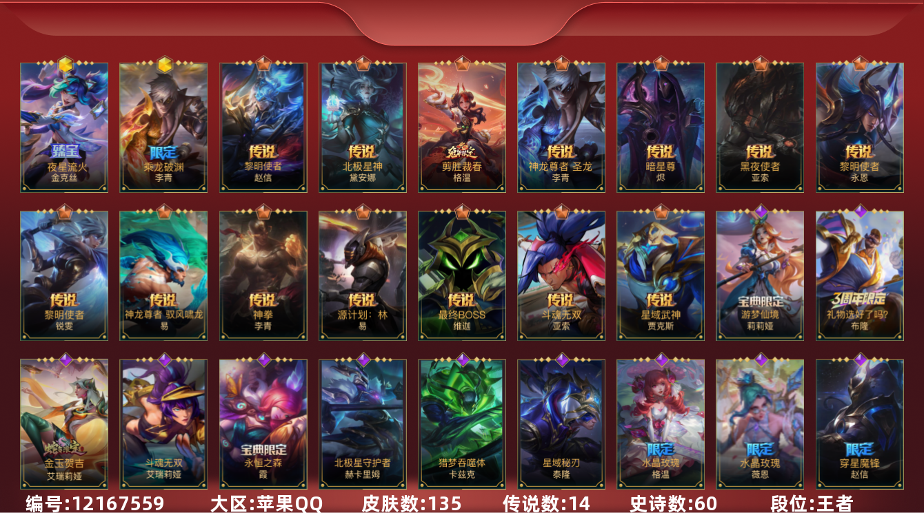 [12167559]2神话 4限定 14传说 60史诗 136皮肤 可二次 可修改实名 优质装备:暗星尊,黑夜使者亚索,黎明使者锐雯,神龙尊者 驭风啸龙,神拳盲僧,剪胜裁春格温,源计划:林,最终BOSS维迦,星域武神贾克斯 段位:王者 神话皮:夜星流火 金克丝,乘龙破渊 李青 限定皮肤:穿星魔锋,赵云子龙,水晶玫瑰蔚,水晶玫瑰锐雯 传说皮:神龙尊者 圣龙 李青,黎明使者 赵信,斗魂无双亚索,北极星神 黛安娜,黎明使者永恩 亮点:暗星尊,黑夜使者亚索,黎明使者锐雯,神龙尊者 驭风啸龙,神拳盲僧,剪胜裁春格温,源计划:林,最终BOSS维迦,星域武神贾克斯