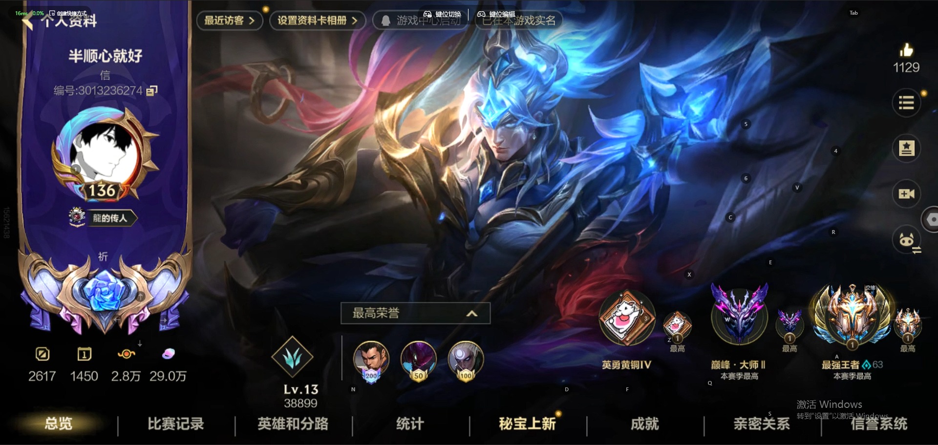 - PX_2108277-实名: 可修改 性别: 男号 贵族等级: V8 英雄数: 125 皮肤数: 177 荣耀水晶: 武则天,鸣剑·曳影 无双皮: 碎月剑心 传说皮: 猫影幻舞,末日机甲-孙尚香,仲夏夜之梦,海洋之心,游龙清影,超时空战士-狄仁杰,妄想实况,妄想奇谈,乘龙·问璇玑,乘龙·铭钟鼎 限定皮: 祈雪灵祝,时雨天司,引擎之心,辉光之辰,青春决赛季,天狼绘梦者,凤求凰,瑞麟志,默契交锋-花木