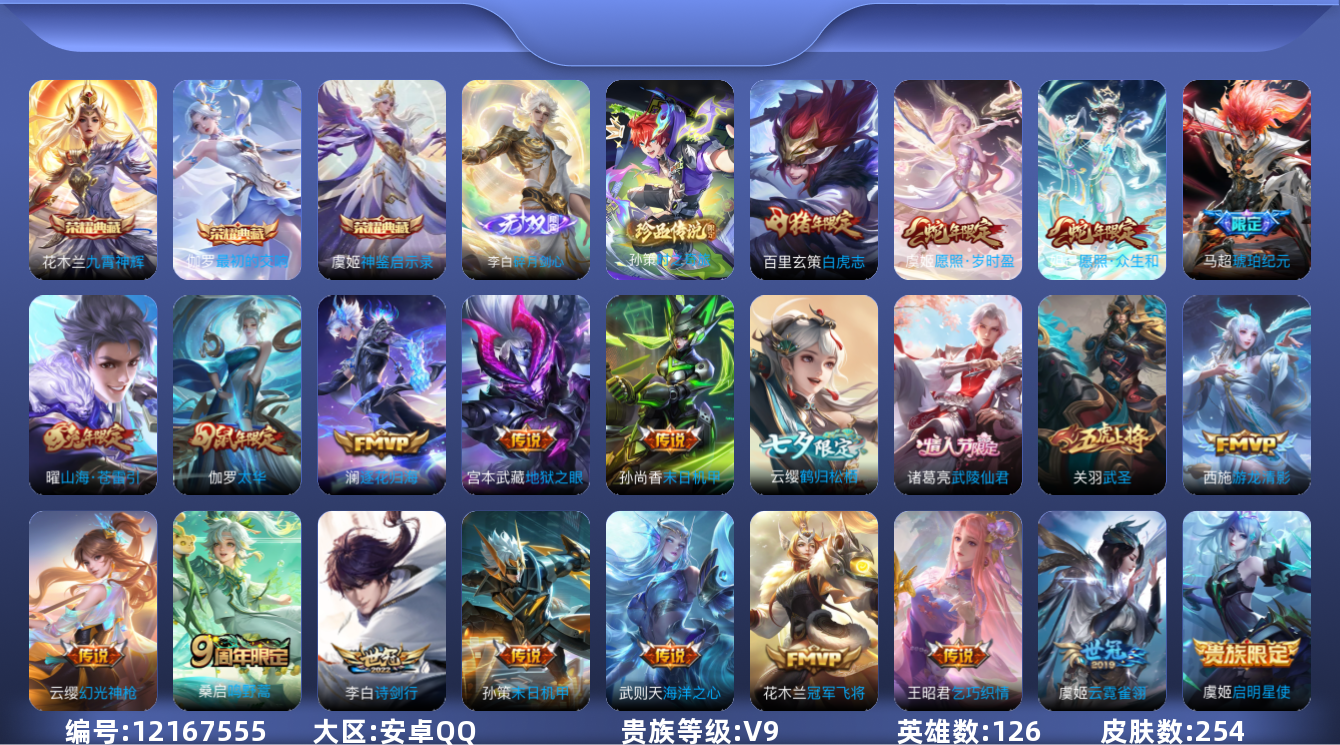 [12167555]V9 3典藏 1无双 1珍品传说 22传说 126英雄 254皮肤 典藏英雄武则天 女号 可修改实名 优质装备:九霄神辉(木兰典藏),碎月剑心(李白无双),神鉴启示录,最初的交响(伽罗典藏),冠军飞将,云霓雀翎,末日机甲-孙尚香(绿蚂蚱),海洋之心,地狱之眼,乞巧织情,游龙清影(小青龙),末日机甲-孙策,山海·苍雷引(电光曜子),鹤归松栖(云缨),澜逐花归海,琥珀纪元马超 珍品传说:时之奇旅-孙策 传说皮:幻光神枪 珍宝阁皮:妄想食味,女武神 限定皮:愿照·岁时盈(虞姬年限),愿照·众生和(妲己年限),鸣野蒿,白虎志(电光耗子),太华(伽罗年限),武陵仙君(小桃花),高山流水,诗剑行,五谷丰年,武圣,梁祝,烈魂,天狼溯光者,逐梦之光,朱雀志(守约年限),一生所爱,大圣娶亲,青春决赛季,蜜橘之夏,山海·玄木吟(马可年限) 史诗皮:狼魂孤将,星界战将,茶境仙,百相守梦-百里守约,遇见神鹿,紫霞仙子,苍穹之光,电玩小子(小书包),特工魅影,千年之狐,永昼,冰冠公主,浮梦罗烟,江河有灵,百解令(蒙犽),高渐离燃音魔法,蒙恬荣光圣徽,电玩·爆裂旋风,偶像歌手,银翎春语,龙骑士(小龙虾),暗夜猫娘,末日机甲-吕布,节奏热浪,女仆咖啡,水果甜心,天才门将,星夜王子,心灵骇客,功夫厨神,德古拉伯爵,暗隐猎兽者,幽灵船长,鬼剑武藏,心灵战警,纤云弄巧,拒霜思,缤纷独角兽,逐浪之夏,水晶猎龙者,曙光守护者,箭羽风息,金属风暴,鹰眼统帅,暗夜贵公子,魅力维加斯,黎明之约,滕王阁序,