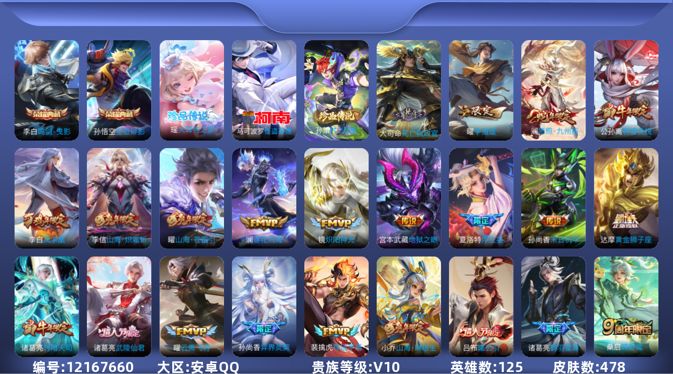 [12167660]V10 2典藏 3珍品传说 40传说 125英雄 478皮肤 可修改实名 优质装备:鸣剑·曳影,全息碎影(猴子典藏),怪盗基德,大耳狗之梦,黄金狮子座,黄金射手座,冠军飞将,云鹰飞将(小将军),久胜战神,炽阳神光,云霓雀翎,末日机甲-孙尚香(绿蚂蚱),地狱火,仲夏夜之梦(大飞蛾),音你心动-小乔,零号·赤焰,地狱之眼,李逍遥,时之恋人-刘备(电焊工),超时空战士-狄仁杰,挚爱之约,挚爱花嫁,山海·炽霜斩(李信年限),山海·琳琅生(小乔年限),山海·苍雷引(电光曜子),画中仙,浮生妄,鹤羽星尊,澜逐花归海,艾琳觅芳踪,玄雷天君,涂山容容 珍品传说:时之奇旅-孙策 传说皮:吕布曦玄引,死亡执政官,祥瑞亨通 珍宝阁皮:妄想食味,优雅恋人,女武神 限定皮:愿照·九州拓(澜年限),逐霄战戟,鸣野蒿,至尊宝,凤求凰(白切鸡),凤凰于飞,武陵仙君(小桃花),异界灵契(白毛香),傲雪梅枪,魔法小厨娘,白晶晶,时雨天司(水龙头),神威(电光马子),飞衡(韩信年限),山海·碧波行(瑶年限),遇见飞天,高山流水,齐天大圣,匿光决锋者,降魔,五谷丰年,青龙志(铠年限),冰锋战神,天狼运算者,游园惊梦,梁祝,御风骁将(吕布年限),天狼狩猎者,龙胆,逐梦之星,烈魂,岱宗(典韦年限),天狼溯光者,天狼征服者,奔雷神使(牛魔年限),祈雪灵祝(雪兔子),天狼绘梦者,李小龙,逐梦之影,逐梦之光,霸王别姬-项羽,默契交锋-花木兰,孙行者,猪悟能,大圣娶亲,引擎之心,乒乒小将,神奇女侠,美猴王,匿光追影者,女儿国国王,百木心枪,启示之音,唐三藏,匿光启智者,梦圆繁星,山海·玄木吟(马可年限) 史诗皮:苍鳞隐世,龙之律动,灵蛊蚀心,星界战将,石田雨龙,茶境仙,百相守梦-黄忠,埋骨钱,破空之剑,蒙犽顽岩魄,蔬乡物语(鲁班七号),百相守梦-百里守约,遇见神鹿,紫霞仙子,苍穹之光,电玩小子(小书包),白龙吟,黄金分割率,特工魅影,千年之狐,永昼,冰冠公主,鹤归松栖(赵怀真),匿光侦查者,江河有灵,青蛇,百解令(蒙犽),高渐离燃音魔法,蒙恬荣光圣徽,魅语,电玩·爆裂旋风,无限星赏官,晚萤,偶像歌手,匿光破解者,百相守梦(刘备),暗夜猫娘,末日机甲-吕布,猫狗日记-孙策,猫狗日记-大乔,时之恋人-孙尚香,乱世虎臣,节奏热浪,修罗,女仆咖啡,摇滚巨星,水果甜心,绅士熊喵,天才门将,星夜王子,心灵骇客,功夫厨神,德古拉