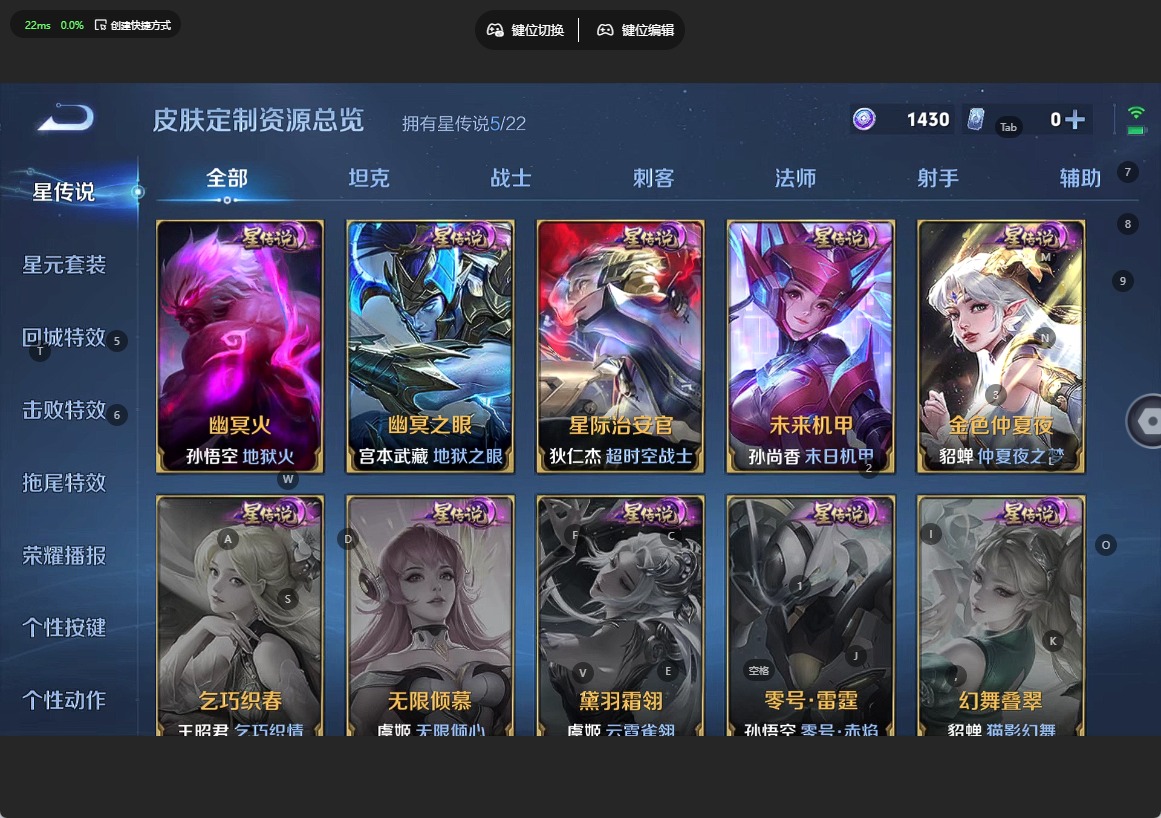 金蝉唐三藏,夏侯惇匿光决锋者,黄忠烈魂,甄姬女儿国国王,盾山梦圆繁星,铠青龙志,曹操天狼征服者,伽罗天狼溯光者,赵云百木心枪,赵云龙胆,孙膑天狼运算者,典韦岱宗,孙尚香异界灵契,牛魔奔雷神使,鲁班七号乒乒小将,项羽霸王别姬,吕布御风骁将,露娜启示之音,镜匿光追影者,诸葛亮时雨天司,公孙离祈雪灵祝,鲁班大师匿光启智者,裴擒虎李小龙,裴擒虎天狼狩猎者,东皇太一逐梦之光,上官婉儿梁祝,上官婉儿天狼绘梦者,花木兰默契交锋,安琪拉魔法小厨娘,马可波罗逐梦之星,马可波罗山海·玄木吟,桑启鸣野蒿,猪八戒猪悟能,孙悟空孙行者,孙悟空大圣娶亲,芈月白晶晶,孙悟空至尊宝,孙悟空美猴王,马超神威,雅典娜神奇女侠,赵云引擎之心,韩信傲雪梅枪,韩信飞衡,韩信逐梦之影,墨子降魔,瑶山海·碧波行,澜愿照·九州拓,王昭君凤凰于飞,关羽冰锋战神