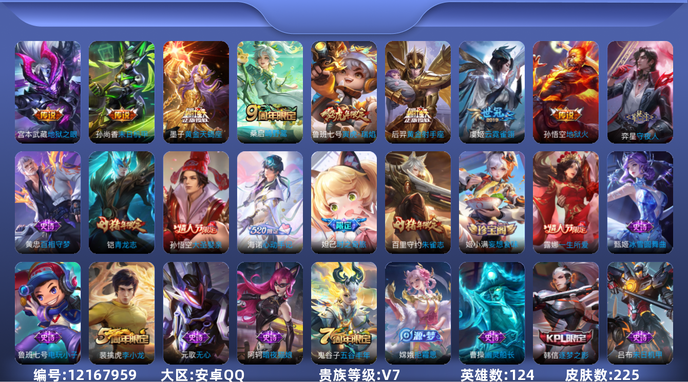 - [11620400]V7 4传说 124英雄 126皮肤 可修改实名 优质装备:云霓雀翎,李逍遥 珍宝阁皮:蔷薇恋人 限定皮:逐霄战戟,齐天大圣,李小龙,无尽星芒 史诗皮:蒙犽顽岩魄,蔬乡物语(鲁班七号),魅语,末日机甲-吕布,猫狗日记-大乔,节奏热浪,女仆咖啡,水果甜心,地狱岩魂,缤纷独角兽,箭羽风息,圣诞狂欢,圣诞恋歌,鹰眼统帅,魅力维加斯,未来纪元-赵云