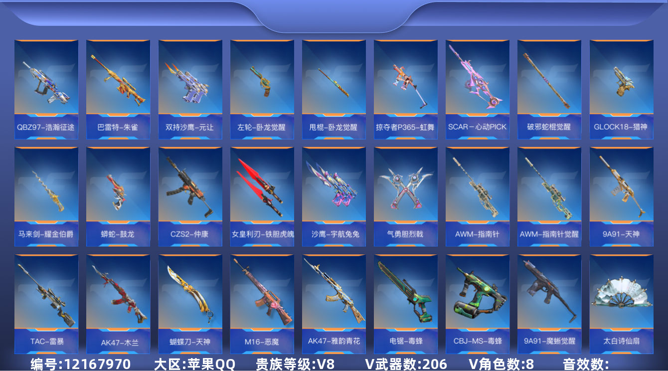 [12167970]V8 4王者武器 206英雄武器 8英雄角色 可二次 可修改实名 优质装备:M4A1-星象,81式-机械纪元,M4A1-仲达,M4A1-游骑兵,M200-幻神,AWM-妙才,CZS2-仲康 v武器:沙鹰-神兵修罗,M14EBR-拂影,SCAR-印刷术,AK47-轮回,QSZ92-华夏传说,M4A1-猎神,SCAR-探星者,PP19野牛-造纸术,打击者-天神,PP19野牛-造纸术觉醒,蝴蝶刀-天神,M16-恶魔,AK47-雅韵青花,电锯-毒蜂,KSG-孟获,CBJ-MS-毒蜂,9A91-魔蜥觉醒,太白诗仙扇,M4A1-太白诗仙,秋逸觉醒,USP-机械迷城,柯尔特-仲达,地狱烈樱·二觉,毁灭征服者-超越Max,加特林-堡垒,AWM-天使,KSG-极光,98K-星神,QBB95-极光,QCW05-变形金刚·大黄蜂,MR1-幽暗骑士,CZS2-血月,手斧-机械迷城,迷你究极泰坦,拳魔小巨兽,QBZ97-浩瀚征途,巴雷特-朱雀,双持沙鹰-元让,沙鹰-宇航兔兔,气勇胆烈戟,AWM-指南针,AWM-指南针觉醒,9A91-天神,TAC-雷暴,AK47-木兰,左轮-卧龙觉醒,甩棍-卧龙觉醒,掠夺者P365-虹舞,SCAR-心动PICK,破邪蛇棍觉醒,GLOCK18-猎神,马来剑-耀金伯爵,女皇利刃-铁胆虎魄,蟒蛇-鼓龙,SCAR-幽暗骑士,M4A1-玫瑰精灵,M200-心动次元觉醒,98K-血月,AK47-火麒麟,M4A1-雷神,AK47-无影,M4A1-黑骑士,AK47-麒麟,M4A1-黑龙,剑齿虎,M4A1-死神,AK47-黑武士觉醒,剑齿虎-炫彩,AN94-超新星,AWM-竞界荣光,CZS2-心动次元觉醒,加特林-炼狱,加特林-堡垒觉醒,刘易斯-血月,加特林-蟒蛇,AWM-天龙,巴雷特-毁灭,巴雷特-极光,巴雷特-雷神,09式狙-天神,AWM-游骑兵,巴雷特-变色龙,98K-黑骑士,AK47-猩红传说,AK47-沙漠郡主-超觉,M4A1-雷霆,AK47-幸运日觉醒,AK47-血武士,AK47-冰魂觉醒,M4A1-竞技战魂,AK47-樱斗士-超觉,M4A1-龙血,AK47-竞技战魂,AK47-机械迷城,AK47-变色龙,CZS2-善财童子,M4A1-卧龙,激光短刃-黑骑士,尼泊尔-星象,血阳,双持尼泊尔-变色龙,蝴蝶刀-极光,双截棍-天使,尼泊尔-机械纪元,尼泊尔-铜头铁臂,斩魔