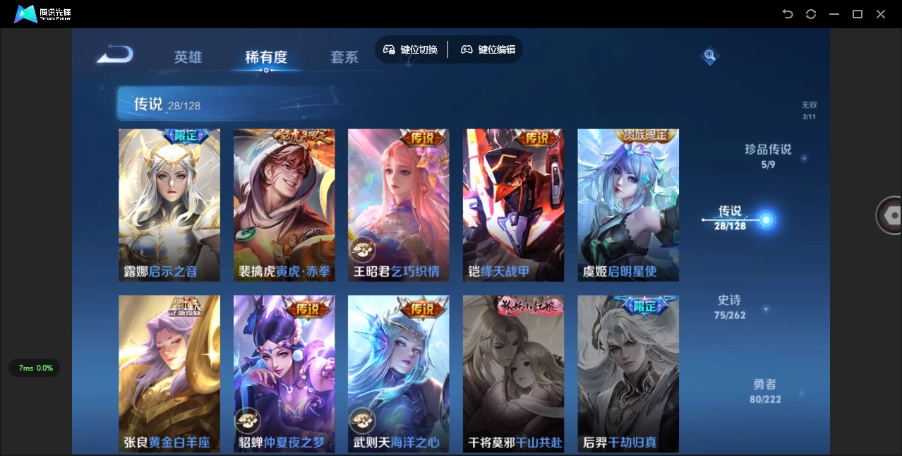 - [11883938]V7 1典藏 1珍品传说 12传说 123英雄 182皮肤 可修改实名 优质装备:鸣剑·曳影,怪盗基德,云鹰飞将(小将军),末日机甲-孙尚香(绿蚂蚱),超时空战士-狄仁杰,记忆之芯(机甲兔),鹤羽星尊,霜月吟 传说皮:貂蝉曦玄引,幻光神枪 珍宝阁皮:妄想食味 限定皮:愿照·千秋盛(女娲年限),鸣野蒿,补天,前尘镜,梁祝,李小龙,大圣娶亲 史诗皮:赞萌露比,器灵·浮梦炉,化蝶舞,星界战将,谪仙醉月,龙之律动,战舞者,蒙犽顽岩魄,琥珀纪元伽罗,百相守梦-百里守约,星界特工,百相守梦-黄忠,守夜人,电玩小子(小书包),特工魅影,永昼,冰冠公主,偶像歌手,晚萤,暗夜猫娘,龙骑士(小龙虾),节奏热浪,摇滚巨星,水果甜心,天才门将,心灵骇客,德古拉伯爵,暗隐猎兽者,鬼剑武藏,暗渊魔法,心灵战警,舞动绿茵,纤云弄巧,缤纷独角兽,逐浪之夏,月团寄思,水晶猎龙者,金属风暴,原初追逐者,圣诞狂欢,圣诞恋歌,鹰眼统帅,魅力维加斯,黎明之约,赏金猎手