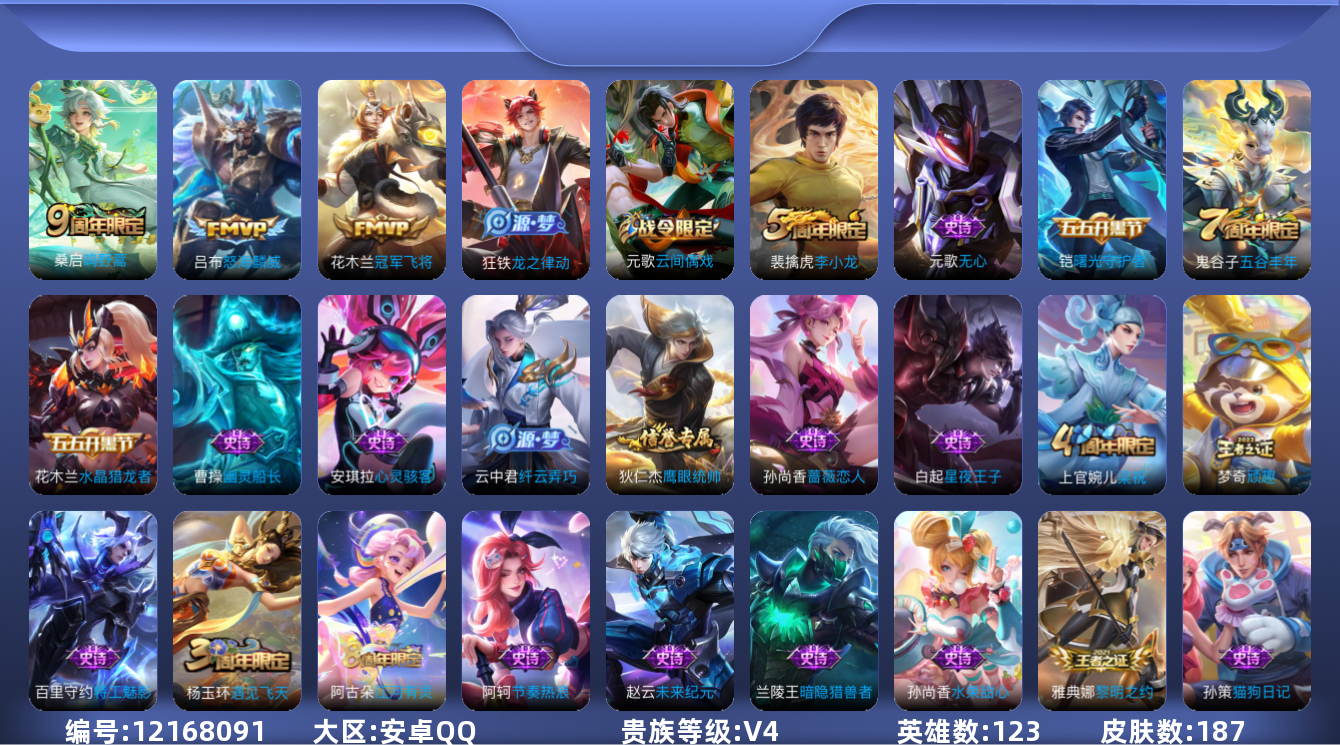 [12168091]【商品标题】:安卓Q-V4-至尊星耀III段位-123英雄-187皮肤-0典藏-0珍品无双-0无双-0珍品传说-3传说-36史诗