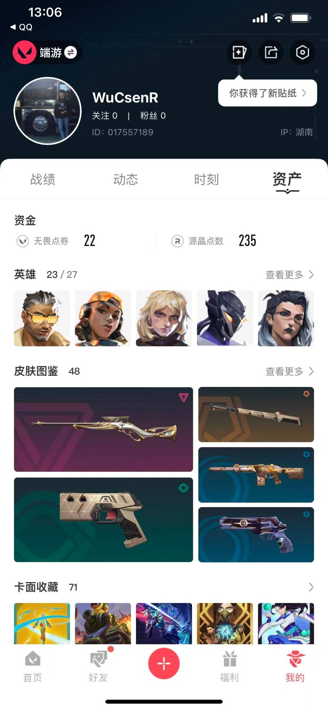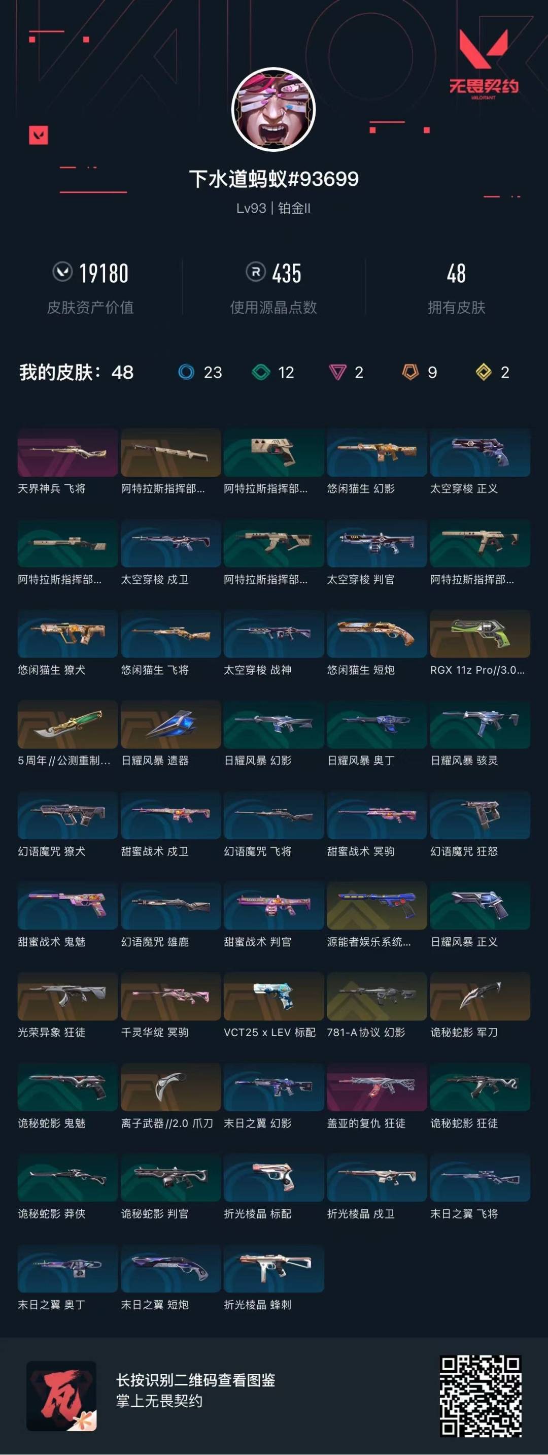 [12168989]9橙皮 2金皮 2紫皮 48皮肤 23英雄 71卡面 435已用源晶 铂金 优质装备:幻影-781-A协议,冥驹-千灵华绽,狂徒-盖亚的复仇,正义-RGX 11z Pro 3.0,鬼魅-源能者娱乐系统,飞将-天界神兵,离子武器2.0 爪刀,诡秘蛇影,苍龙之刃,阿特拉斯指挥部 佩枪皮肤:标配-VCT25xLEV 步枪皮肤:狂徒-光荣异象