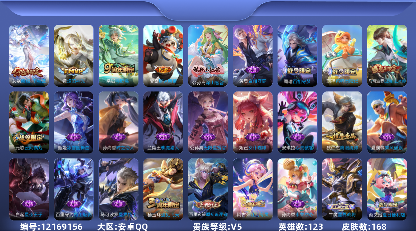 [12169156]V5 4传说 123英雄 168皮肤 可修改实名 优质装备:炽阳神光,胖达荣荣,涂山容容 珍宝阁皮:女武神 限定皮:愿照·千秋盛(女娲年限),鸣野蒿,遇见飞天,山海·玄木吟(马可年限) 史诗皮:鸭鸭历险记-刘禅,星界战将,百相守梦-周瑜,蒙犽顽岩魄,星界特工,百相守梦-黄忠,特工魅影,江河有灵,百解令(蒙犽),无限星赏官,偶像歌手,时之恋人-孙尚香,乱世虎臣,女仆咖啡,摇滚巨星,水果甜心,天才门将,星夜王子,心灵骇客,德古拉伯爵,鬼剑武藏,心灵战警,乐园奇幻夜,地狱岩魂,缤纷独角兽,乘风破浪,箭羽风息,金属风暴,原初追逐者,圣诞狂欢,鹰眼统帅,魅力维加斯