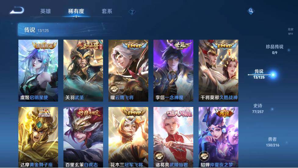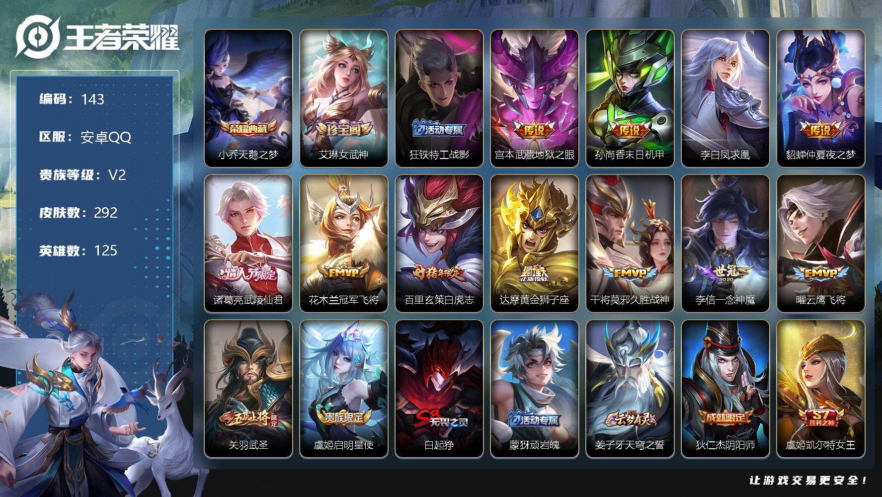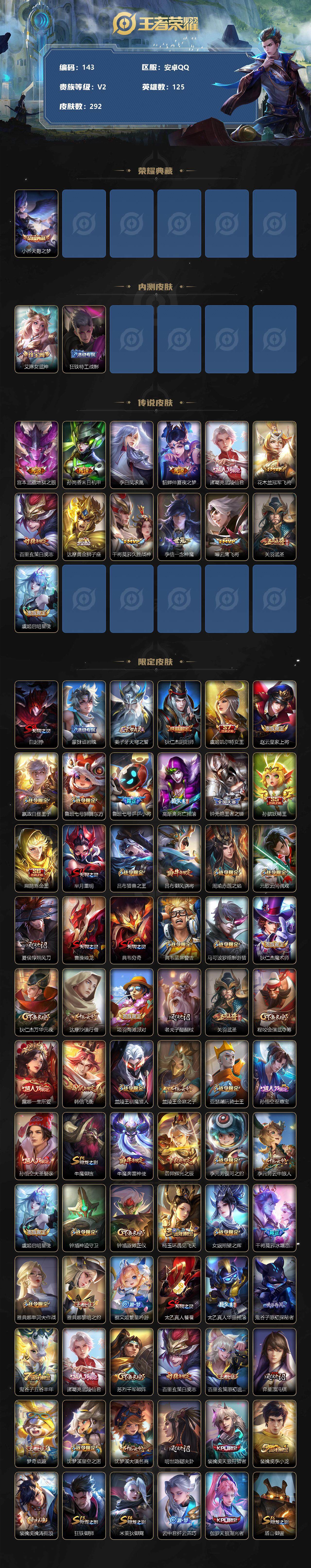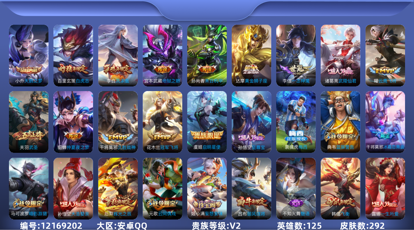 [12169202]【商品标题】:安卓Q-V2-最强王者段位-125英雄-292皮肤-1典藏-0珍品无双-0无双-0珍品传说-13传说-77史诗