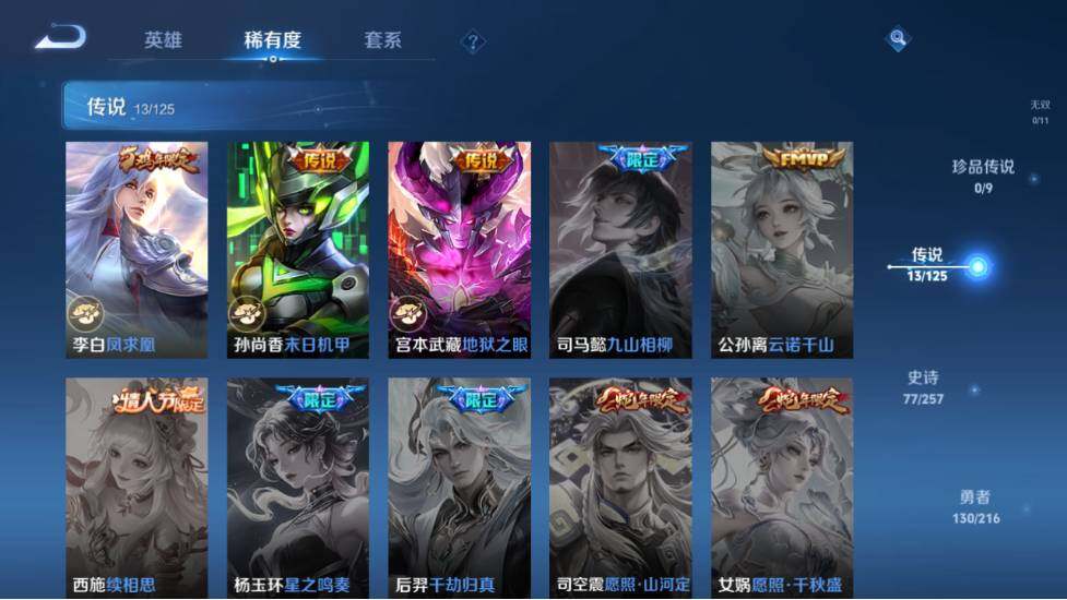 【传说皮肤】:宫本武藏地狱之眼,孙尚香末日机甲,李白凤求凰,貂蝉仲夏夜之梦,诸葛亮武陵仙君,花木兰冠军飞将,百里玄策白虎志,达摩黄金狮子座,干将莫邪久胜战神,李信一念神魔,曜云鹰飞将,关羽武圣,虞姬启明星使
