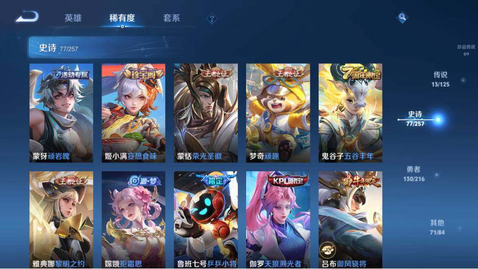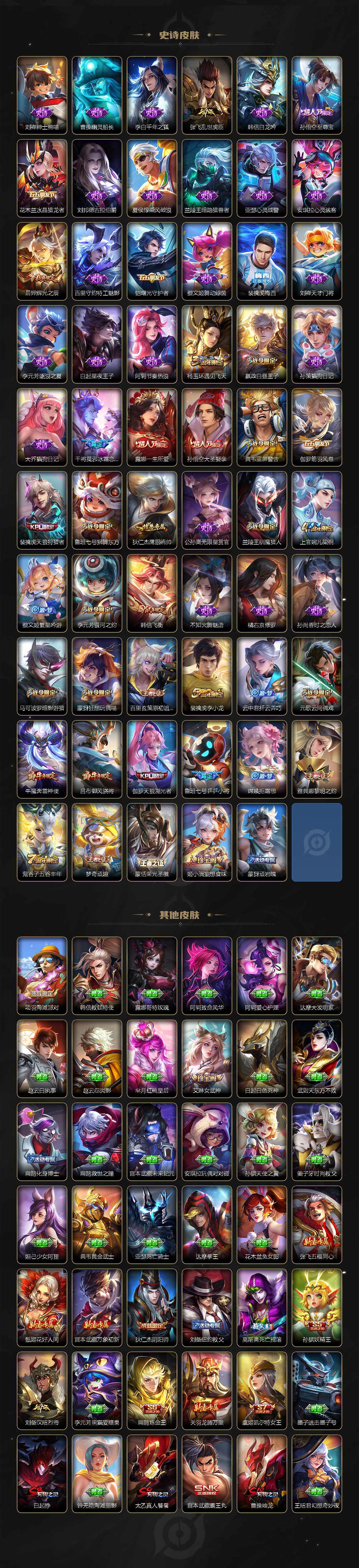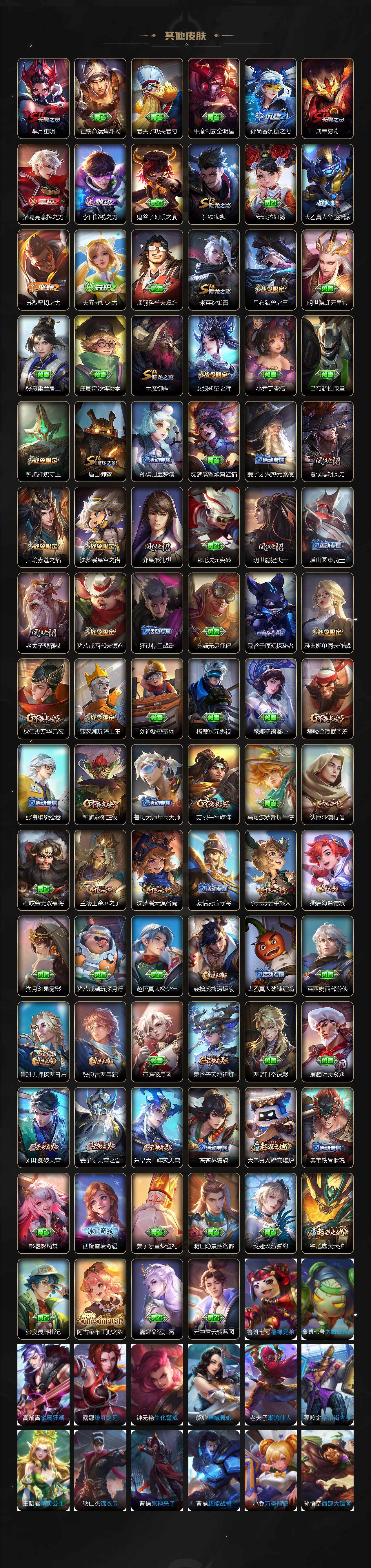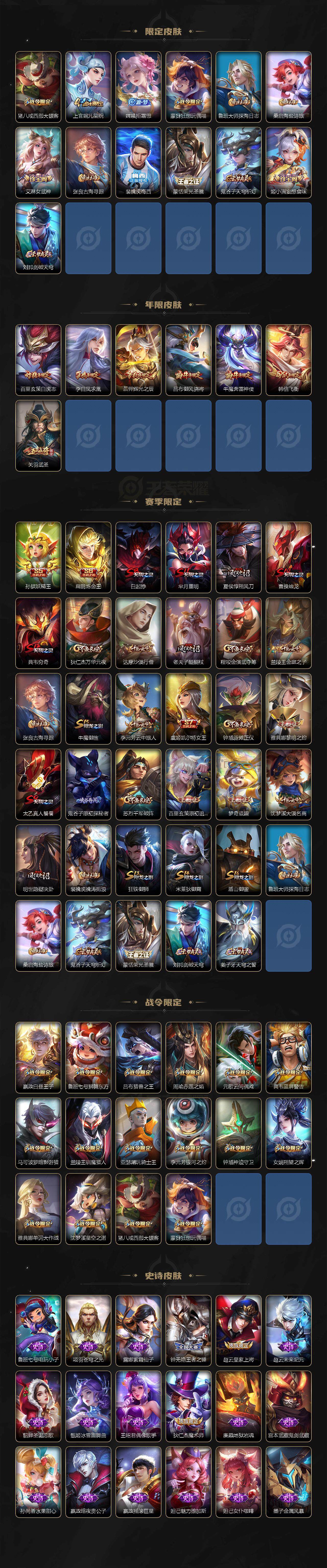 【限定皮肤】:白起狰,蒙犽顽岩魄,姜子牙天穹之誓,狄仁杰阴阳师,虞姬凯尔特女王,赵云皇家上将,嬴政白昼王子,鲁班七号狮舞东方,鲁班七号乒乒小将,高渐离死亡摇滚,钟无艳王者之锤,孙膑妖精王,扁鹊炼金王,芈月重明,吕布猎兽之王,吕布御风骁将,周瑜赤莲之焰,元歌云间偶戏,夏侯惇朔风刀,曹操烛龙,典韦穷奇,典韦蓝屏警告,马可波罗暗影游猎,狄仁杰魔术师,狄仁杰万华元夜,达摩沙漠行僧,项羽海滩派对,老夫子醍醐杖,关羽武圣,程咬金演武夺筹,露娜一生所爱,韩信飞衡,兰陵王驯魔猎人,兰陵王金庭之子,亚瑟潮玩骑士王,孙悟空至尊宝,孙悟空大圣娶亲,牛魔御旌,牛魔奔雷神使,后羿辉光之辰,李元芳银河之约,李元芳云中旅人,虞姬启明星使,钟馗神迹守卫,钟馗驱傩正仪,杨玉环遇见飞天,女娲朔望之晖,干将莫邪冰霜恋舞曲,雅典娜单词大作战,雅典娜黎明之约,蔡文姬繁星吟游,太乙真人饕餮,太乙真人华丽摇滚,鬼谷子原初探秘者,鬼谷子五谷丰年,诸葛亮武陵仙君,苏烈千军破阵,百里玄策白虎志,百里玄策原初追逐者,弈星混沌棋,梦奇顽趣,沈梦溪星空之诺,沈梦溪大漠名商,明世隐疑决卦,裴擒虎天狼狩猎者,裴擒虎李小龙,裴擒虎擒涛扼浪,狂铁御狮,米莱狄御霄,云中君纤云弄巧,伽罗天狼溯光者,盾山御銮,猪八戒西部大镖客,上官婉儿梁祝,嫦娥拒霜思,蒙犽狂想玩偶喵,鲁班大师探海日志,桑启海盐诗旅,艾琳女武神,张良古海寻踪,裴擒虎梅西,蒙恬荣光圣徽,鬼谷子天穹祈灯,姬小满妄想食味,刘邦剑破天穹