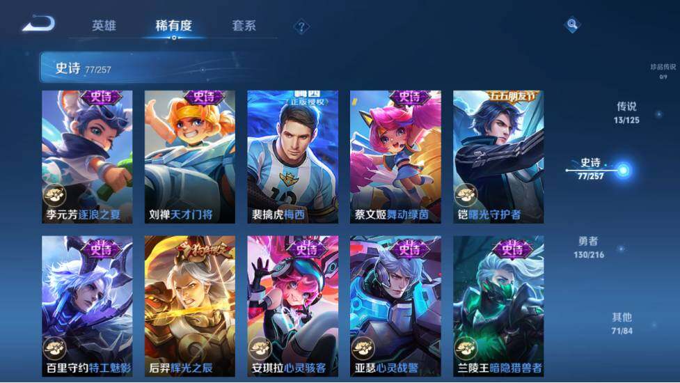 - [11884251]V7 8传说 125英雄 249皮肤 可修改实名 优质装备:末日机甲-孙尚香(绿蚂蚱),乞巧织情,山海·炽霜斩(李信年限),山海·琳琅生(小乔年限),炽翼辉光(娃娃菜牛角包) 珍宝阁皮:蔷薇恋人,女武神 限定皮:逐霄战戟,鸣野蒿,至尊宝,凤求凰(白切鸡),山海·碧波行(瑶年限),遇见飞天,高山流水,五谷丰年,冰锋战神,游园惊梦,梁祝,李小龙,猪悟能,冰霜恋舞曲,蜜橘之夏,时之祈愿-瑶(瑶传限),山海·玄木吟(马可年限) 史诗皮:化蝶舞,紫霞仙子,苍穹之光,电玩小子(小书包),千年之狐,魅语,晚萤,节奏热浪,女仆咖啡,摇滚巨星,水果甜心,绅士熊喵,天才门将,星夜王子,心灵骇客,功夫厨神,暗隐猎兽者,幽灵船长,鬼剑武藏,心灵战警,舞动绿茵,纤云弄巧,繁星吟游(呼啦呼啦),拒霜思,缤纷独角兽,乘风破浪,逐浪之夏,水晶猎龙者,金属风暴,原初追逐者,圣诞狂欢,圣诞恋歌,鹰眼统帅,王者之锤,魅力维加斯,黎明之约,无心