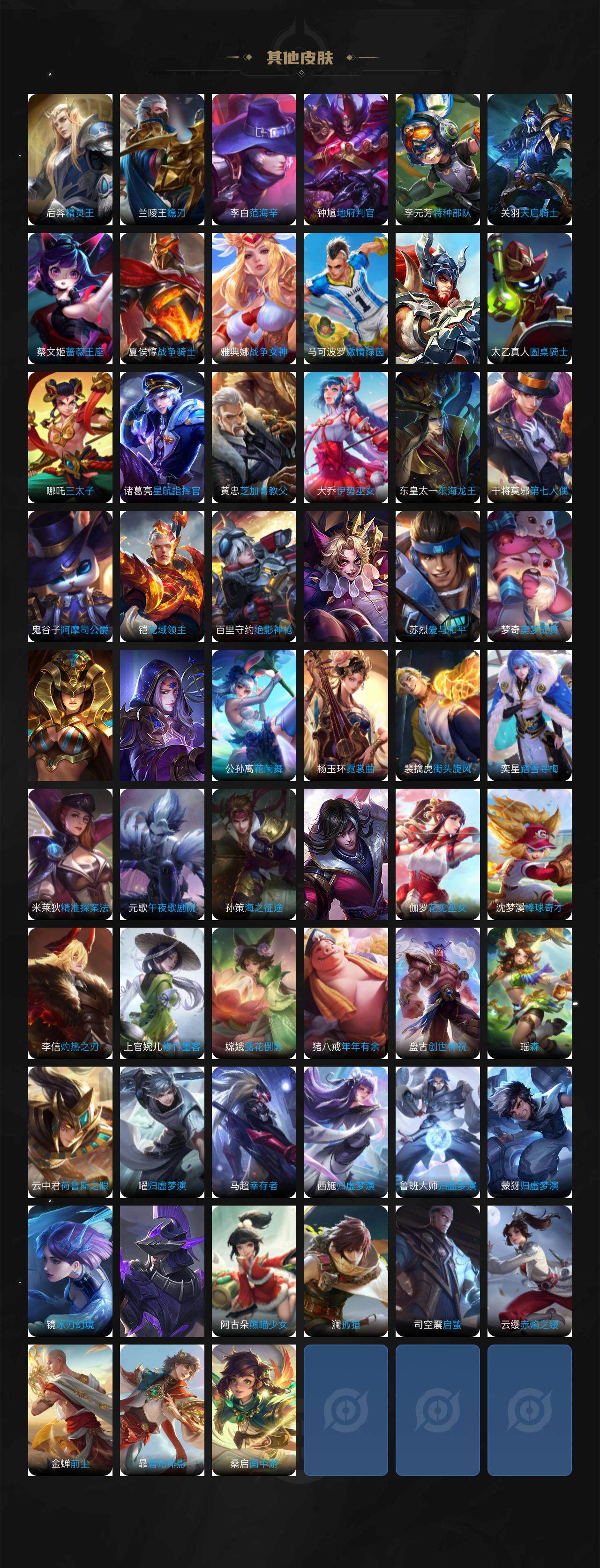 孙膑妖精王,扁鹊炼金王,虞姬凯尔特女王,白起狰,太乙真人饕餮,曹操烛龙,芈月重明,典韦穷奇,狂铁御狮,米莱狄御霄,牛魔御旌,盾山御銮,夏侯惇朔风刀,明世隐疑决卦,老夫子醍醐杖,鬼谷子原初探秘者,狄仁杰万华元夜,程咬金演武夺筹,钟馗驱傩正仪,苏烈千军破阵,吕布猎兽之王,嬴政白昼王子,女娲朔望之晖,典韦蓝屏警告,钟馗神迹守卫,鲁班七号狮舞东方,沈梦溪星空之诺,李元芳银河之约,马可波罗暗影游猎,蒙犽狂想玩偶喵,元歌云间偶戏,弈星混沌棋,达摩沙漠行僧,兰陵王金庭之子,沈梦溪大漠名商,李元芳云中旅人,桑启海盐诗旅,裴擒虎擒涛扼浪,鲁班大师探海日志,张良古海寻踪