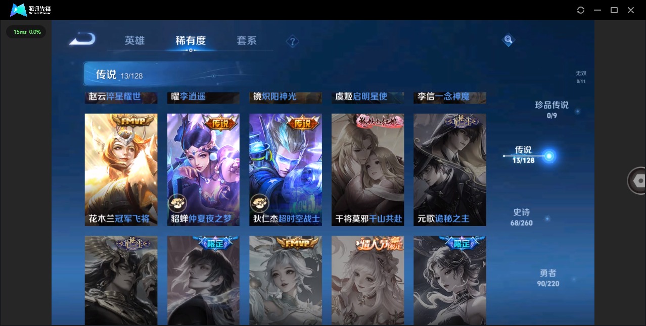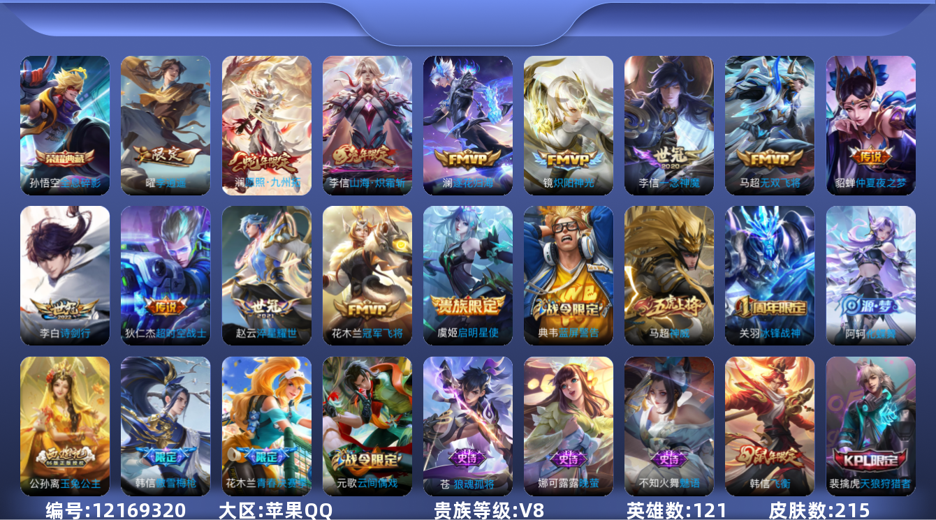 [12169320]V8 1典藏 13传说 121英雄 215皮肤 可修改实名 优质装备:全息碎影(猴子典藏),冠军飞将,炽阳神光,一念神魔,仲夏夜之梦(大飞蛾),李逍遥,淬星耀世,超时空战士-狄仁杰,无双飞将,山海·炽霜斩(李信年限),澜逐花归海 珍宝阁皮:蔷薇恋人,玩趣恶龙 限定皮:愿照·九州拓(澜年限),傲雪梅枪,神威(电光马子),飞衡(韩信年限),遇见飞天,诗剑行,冰锋战神,梁祝,天狼狩猎者,天狼征服者,李小龙,真爱至上,纯白花嫁,青春决赛季,百木心枪,玉兔公主 史诗皮:狼魂孤将,绮世丹青,瑰影绮梦,化蝶舞,茶境仙,星界特工,紫霞仙子,苍穹之光,黄金分割率,千年之狐,永昼,魅语,无限星赏官,冰冠公主,偶像歌手,晚萤,龙骑士(小龙虾),猫狗日记-孙策,节奏热浪,修罗,女仆咖啡,水果甜心,星夜王子,暗隐猎兽者,幽灵船长,鬼剑武藏,暗渊魔法,心灵战警,纤云弄巧,缤纷独角兽,乘风破浪,逐浪之夏,曙光守护者,原初追逐者,圣诞狂欢,圣诞恋歌,鹰眼统帅,魅力维加斯,黎明之约,赏金猎手,无心