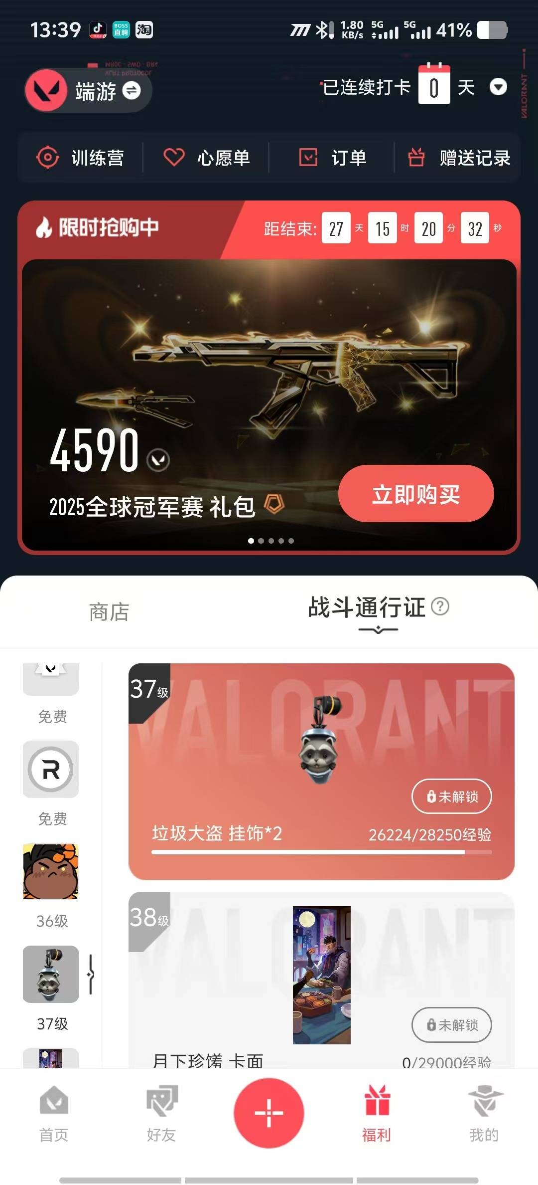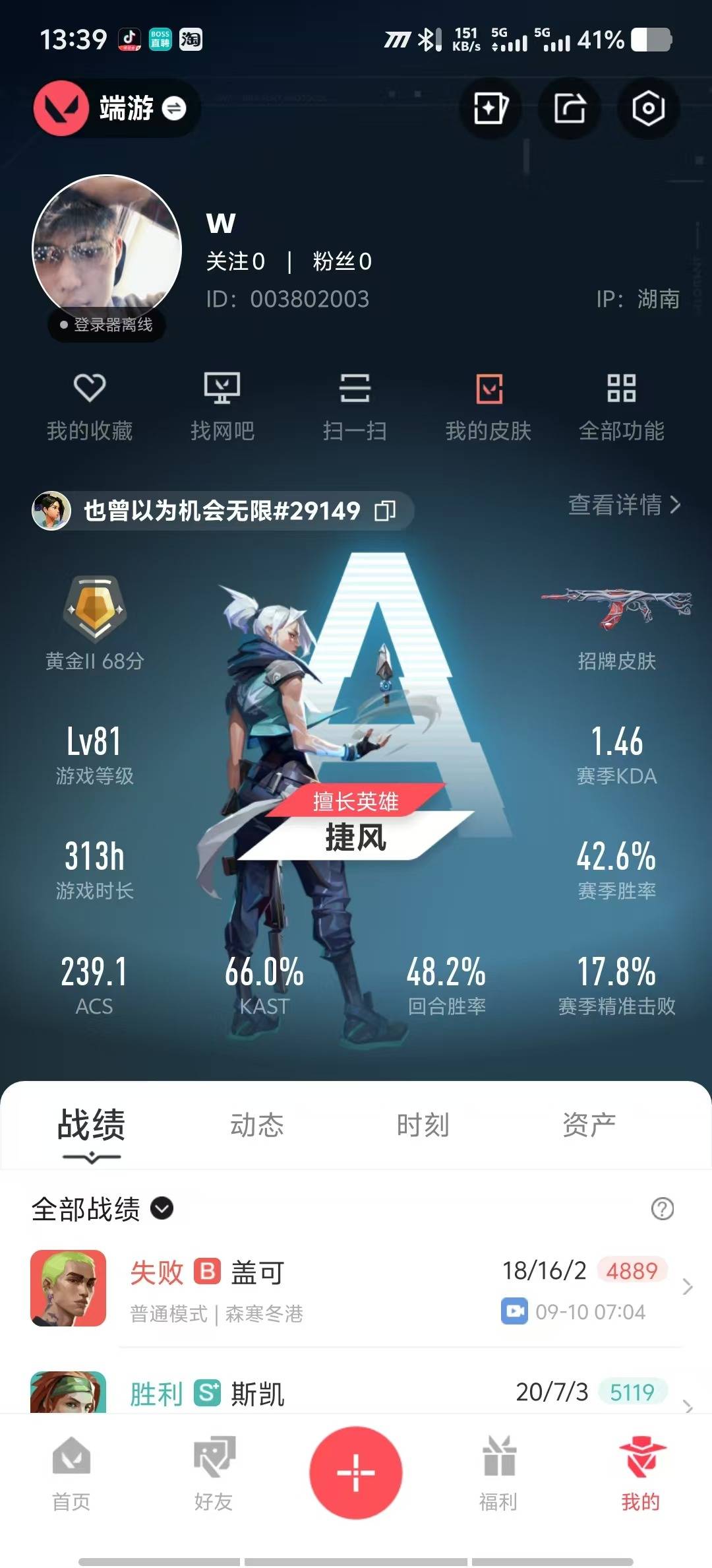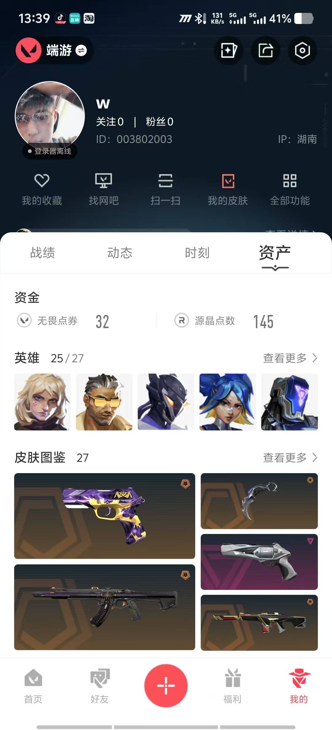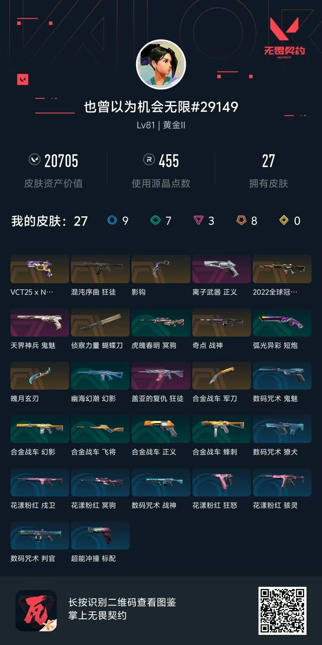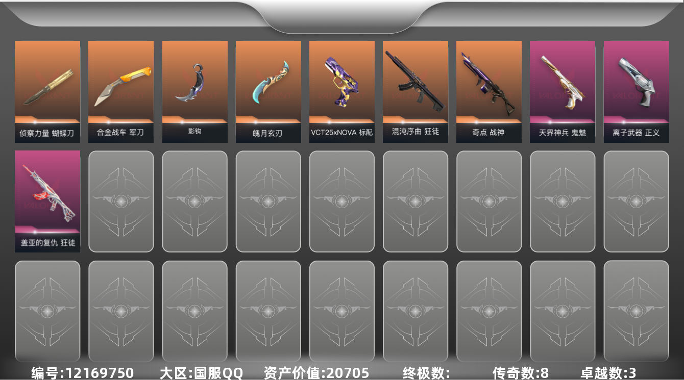 [12169750]8橙皮 3紫皮 27皮肤 25英雄 62卡面 455已用源晶 黄金 优质装备:狂徒-混沌序曲,狂徒-盖亚的复仇,正义-离子武器,军刀-合金战车,魄月玄刃,蝴蝶刀-侦察力量,鬼魅-天界神兵,影钩 佩枪皮肤:标配-VCT25xNOVA 机枪皮肤:战神-奇点